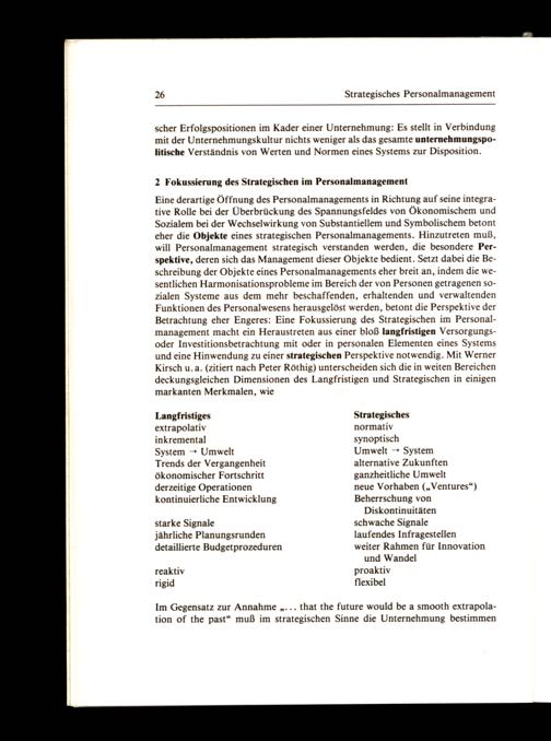 Eine derartige Öffnung des Personalmanagements in Richtung auf seine integrative Rolle bei der Überbrückung des Spannungsfeldes von Ökonomischem und Sozialem bei der Wechselwirkung von Substantiellem und Symbolischem betont eher die Objekte eines strategischen Personalmanagements. Hinzutreten muß, will Personalmanagement strategisch verstanden werden, die besondere Perspektive, deren sich das Management dieser Objekte bedient. Setzt dabei die Beschreibung der Objekte eines Personalmanagements eher breit an, indem die wesentlichen Harmonisationsprobleme im Bereich der von Personen getragenen sozialen Systeme aus dem mehr beschaffenden, erhaltenden und verwaltenden Funktionen des Personalwesens herausgelöst werden, betont die Perspektive der Betrachtung eher Engeres: Eine Fokussierung des Strategischen im Personalmanagement macht ein Heraustreten aus einer bloß langfristigen Versorgungsoder Investitionsbetrachtung mit oder in personalen Elementen eines Systems und eine Hinwendung zu einer strategischen Perspektive notwendig. Mit Werner Kirsch u. a.(zitiert nach Peter Röthig) unterscheiden sich die in weiten Bereichen deckungsgleichen Dimensionen des Langfristigen und Strategischen in einigen markanten Merkmalen, wie