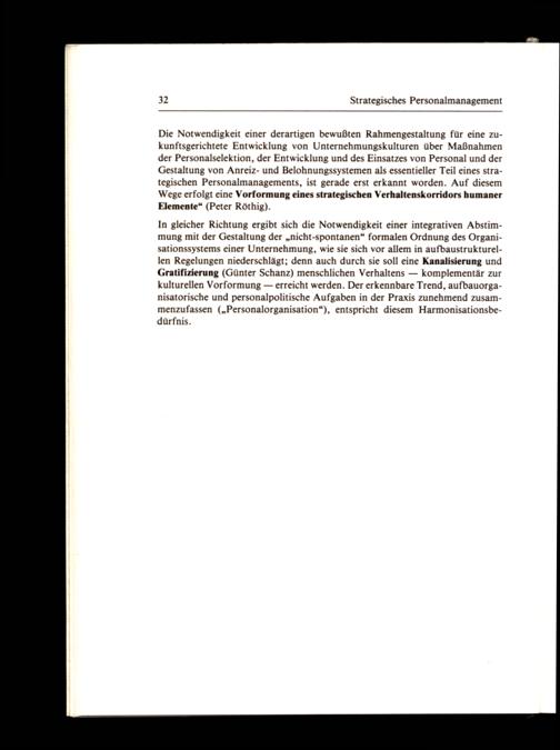 Die Notwendigkeit einer derartigen bewußten Rahmengestaltung für eine zukunftsgerichtete Entwicklung von Unternehmungskulturen über Maßnahmen der Personalselektion, der Entwicklung und des Einsatzes von Personal und der Gestaltung von Anreiz- und Belohnungssystemen als essentieller Teil eines strategischen Personalmanagements, ist gerade erst erkannt worden. Auf diesem Wege erfolgt eine Vorformung eines strategischen Verhaltenskorridors humaner Elemente“(Peter Röthig).