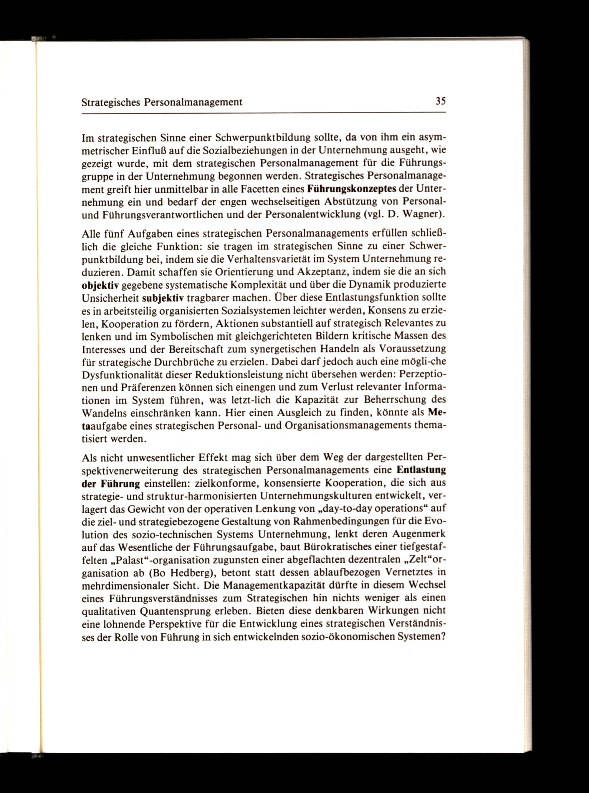 Als nicht unwesentlicher Effekt mag sich über dem Weg der dargestellten Perspektivenerweiterung des strategischen Personalmanagements eine Entlastung der Führung einstellen: zielkonforme, konsensierte Kooperation, die sich aus strategie- und struktur-harmonisierten Unternehmungskulturen entwickelt, verlagert das Gewicht von der operativen Lenkung von„day-to-day operations“ auf die ziel- und strategiebezogene Gestaltung von Rahmenbedingungen für die Evolution des sozio-technischen Systems Unternehmung, lenkt deren Augenmerk auf das Wesentliche der Führungsaufgabe, baut Bürokratisches einer tiefgestaffelten„Palast“-organisation zugunsten einer abgeflachten dezentralen„Zelt“organisation ab(Bo Hedberg), betont statt dessen ablaufbezogen Vernetztes in mehrdimensionaler Sicht. Die Managementkapazität dürfte in diesem Wechsel eines Führungsverständnisses zum Strategischen hin nichts weniger als einen qualitativen Quantensprung erleben. Bieten diese denkbaren Wirkungen nicht eine lohnende Perspektive für die Entwicklung eines strategischen Verständnisses der Rolle von Führung in sich entwickelnden sozio-ökonomischen Systemen?