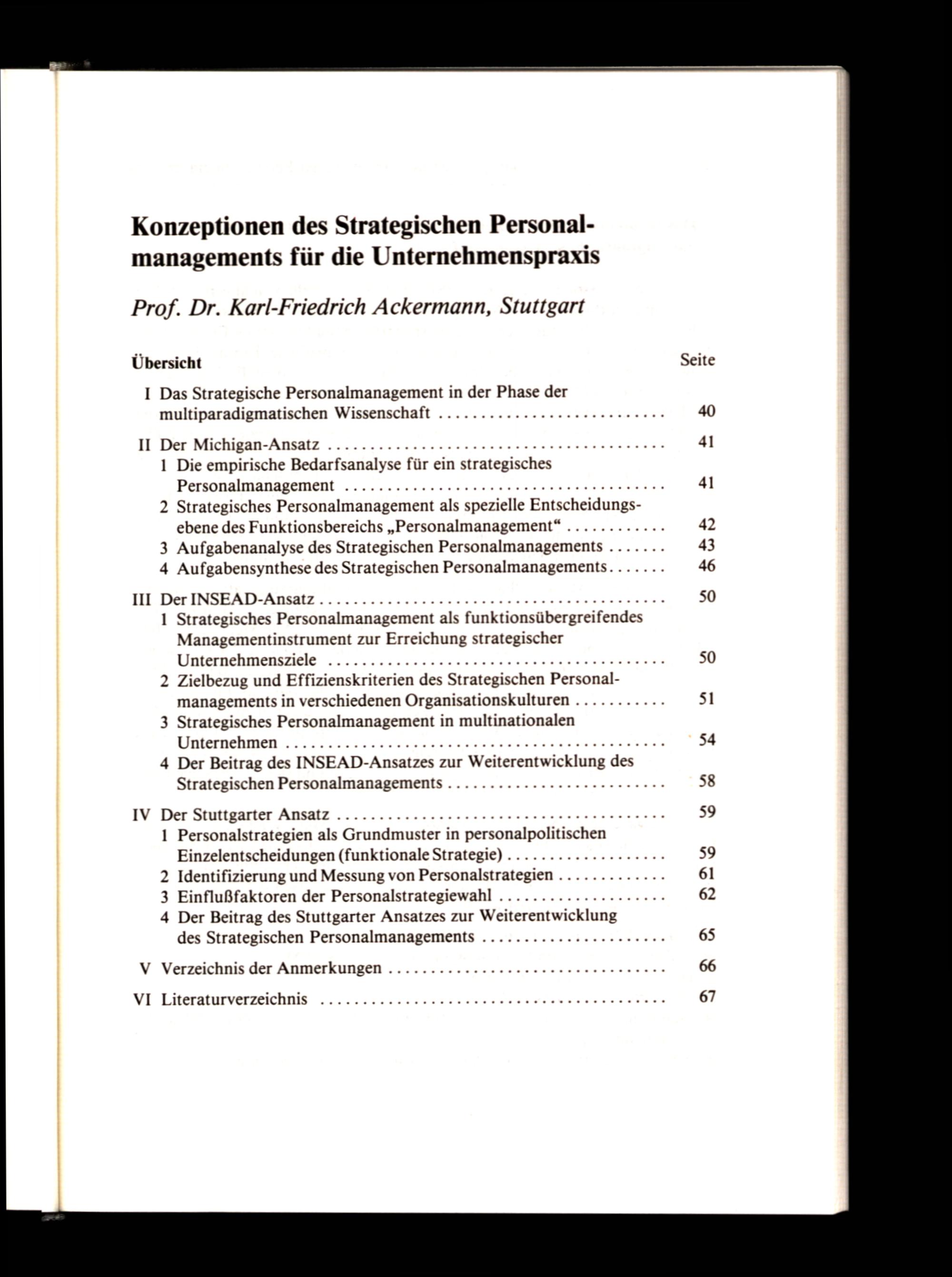 Übersicht I Das Strategische Personalmanagement in der Phase der multiparadigmatischen Wissenschaft II Der Michigan-AnsatZ 1 Die empirische Bedarfsanalyse für ein strategisches Personalmanagement 2 Strategisches Personalmanagement als spezielle Entscheidungsebene des Funktionsbereichs„Personalmanagement“ 3 Aufgabenanalyse des Strategischen Personalmanagements 4 Aufgabensynthese des Strategischen Personalmanagements. Ill. Der INSEAD-ANsalZ 1 Strategisches Personalmanagement als funktionsübergreifendes Managementinstrument zur Erreichung strategischer Unternehmensziele 2 Zielbezug und Effizienskriterien des Strategischen Personalmanagements in verschiedenen Organisationskulturen 3 Strategisches Personalmanagement in multinationalen Unternehmen 4 Der Beitrag des INSEAD-Ansatzes zur Weiterentwicklung des Strategischen PersonalmanagementS IV Der Stuttgarter AnsatZ 1 Personalstrategien als Grundmuster in personalpolitischen Einzelentscheidungen(funktionale Strategie) 2 Identifizierung und Messung von Personalstrategien 3 Einflußfaktoren der Personalstrategiewahl 62 4 Der Beitrag des Stuttgarter Ansatzes zur Weiterentwicklung des Strategischen PersonalmanagementS VY Verzeichnis der Anmerkungen