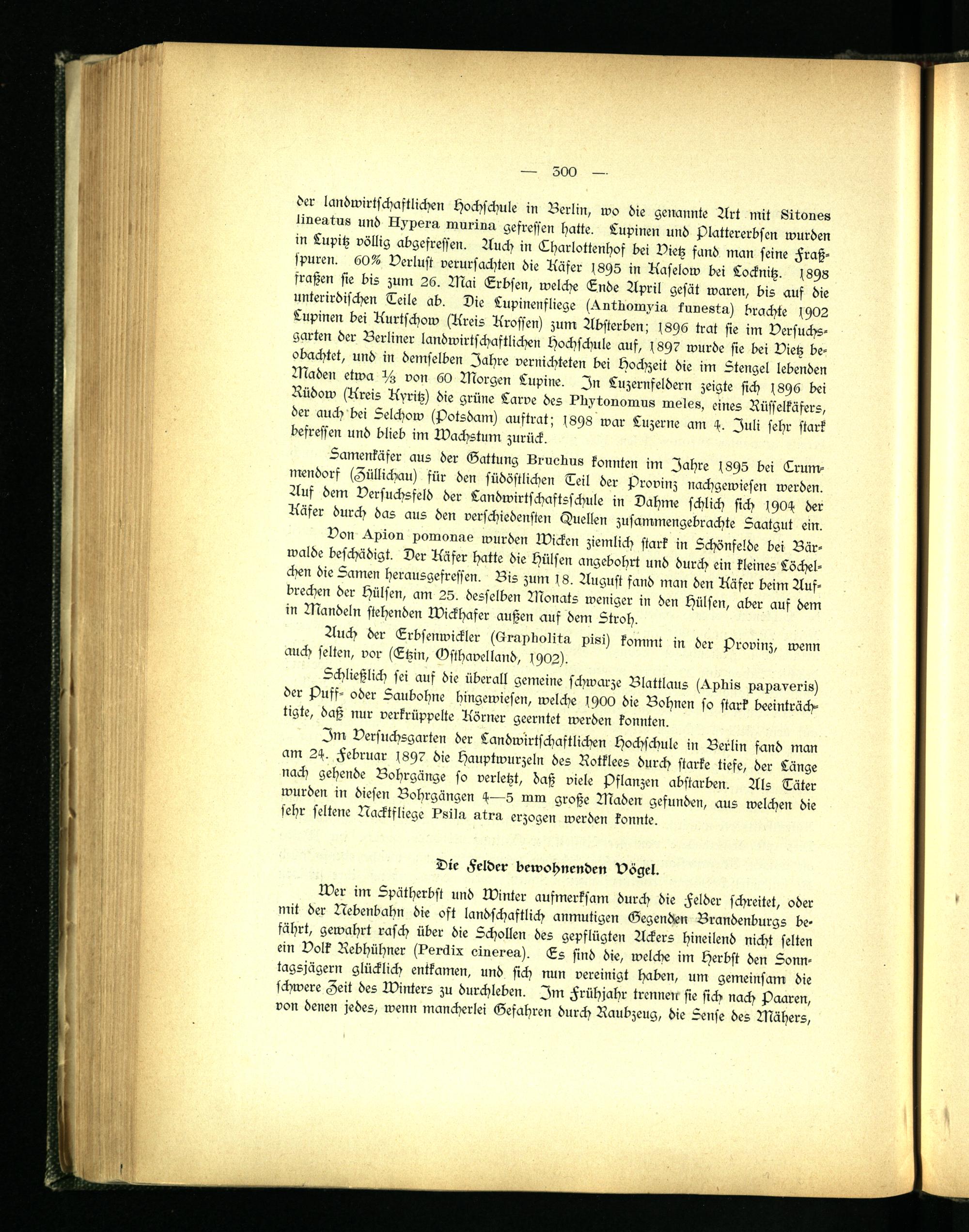 der landwirtschaftlichen Hochschule in Berlin, wo die genannte Art mit Kltones tineatus und Uppera murinu gefressen hatte. Lupinen und Plattererbsen wurden in Lupitz völlig abgefressen. Auch in Tharlottenhof bei Vietz fand man seine Fraßspuren. 60?» Verlust verursachten die Käfer 1895 in Kaselow bei Locknitz. 18ß8 fraßen sie bis zum 26. Mai Erbsen, welche Ende April gesät waren, bis auf die unterirdischen Teile ab. Die Lupinenfliege (Imtbomviu kuvssta) brachte Ist 02 Lupinen bei Kurtschow (Kreis Krossen) zum Absterben; 1896 trat sie im Versuchsgarten der Berliner landwirtschaftlichen Hochschule auf, f 89 ? wurde sie bei Vietz beobachtet, und in demselben Jahre vernichteten bei Hochzeit die im Stengel lebenden Maden etwa Hst von 60 Morgen Lupine. In Luzernfeldern zeigte sich 1,896 bei Rüdow (Kreis Kyritz) die grüne Larve des kb^bonoinns insles, eines Rüsselkäfers, der auch bei Selchow (Potsdam) auftrat; 18 98 war Luzerne am 4. Juli sehr stark befressen und blieb im Wachstum zurück.
