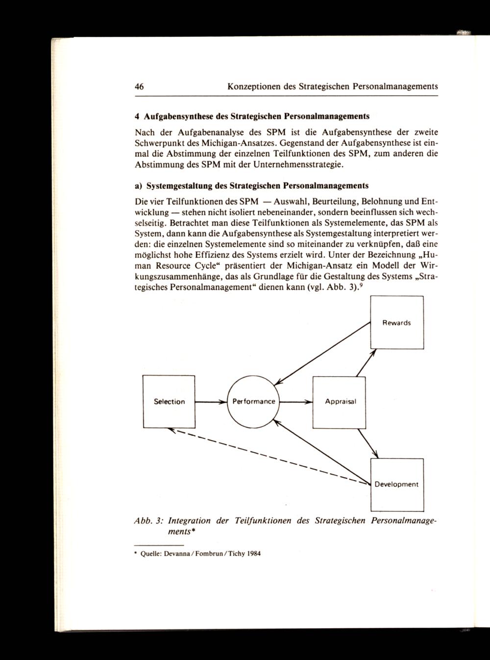 Die vier Teilfunktionen des SPM— Auswahl, Beurteilung, Belohnung und Entwicklung— stehen nicht isoliert nebeneinander, sondern beeinflussen sich wechselseitig. Betrachtet man diese Teilfunktionen als Systemelemente, das SPM als System, dann kann die Aufgabensynthese als Systemgestaltung interpretiert werden: die einzelnen Systemelemente sind so miteinander zu verknüpfen, daß eine möglichst hohe Effizienz des Systems erzielt wird. Unter der Bezeichnung„Human Resource Cycle“ präsentiert der Michigan-Ansatz ein Modell der Wirkungszusammenhänge, das als Grundlage für die Gestaltung des Systems„Strategisches Personalmanagement“ dienen kann(vgl. Abb. 3).°