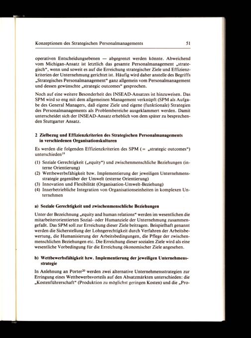 Noch auf eine weitere Besonderheit des INSEAD-Ansatzes ist hinzuweisen. Das SPM wird so eng mit dem allgemeinen Management verknüpft(SPM als Aufgabe des General Managers, daß eigene Ziele und eigene(funktionale) Strategien des Personalmanagements als Problembereiche ausgeklammert werden. Damit unterscheidet sich der INSEAD-Ansatz erheblich von dem später zu besprechenden Stuttgarter Ansatz.