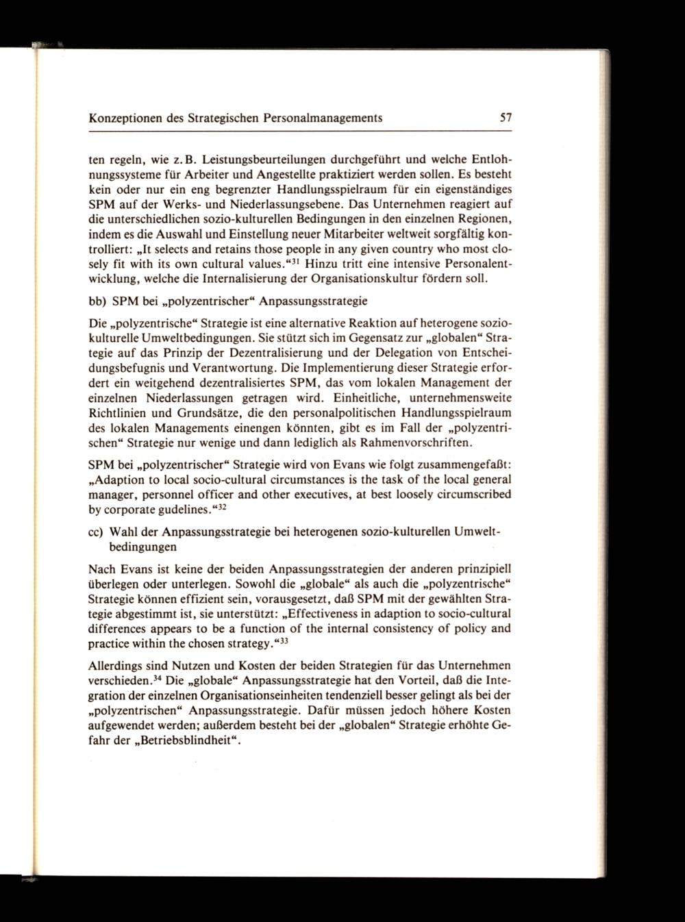 SPM bei„polyzentrischer“ Strategie wird von Evans wie folgt zusammengefaßt: „Adaption to local socio-cultural circumstances is the task of the local general manager, personnel officer and other executives, at best loosely circumscribed by corporate gudelines.“?2