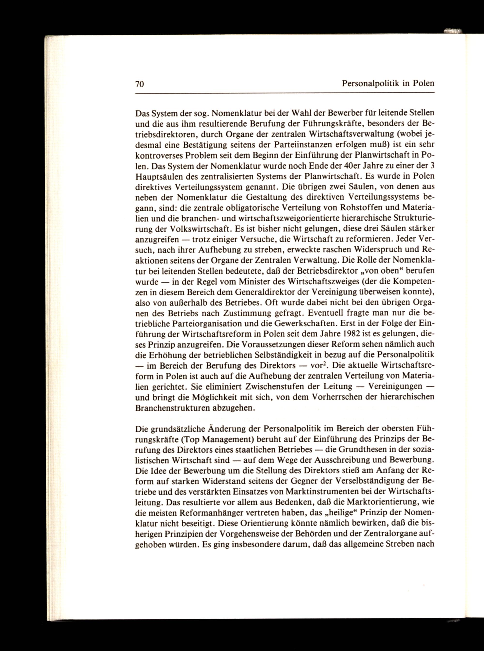 Die grundsätzliche Änderung der Personalpolitik im Bereich der obersten Führungskräfte(Top Management) beruht auf der Einführung des Prinzips der Berufung des Direktors eines staatlichen Betriebes— die Grundthesen in der sozialistischen Wirtschaft sind— auf dem Wege der Ausschreibung und Bewerbung. Die Idee der Bewerbung um die Stellung des Direktors stieß am Anfang der Reform auf starken Widerstand seitens der Gegner der Verselbständigung der Betriebe und des verstärkten Einsatzes von Marktinstrumenten bei der Wirtschaftsleitung. Das resultierte vor allem aus Bedenken, daß die Marktorientierung, wie die meisten Reformanhänger vertreten haben, das„heilige“ Prinzip der Nomenklatur nicht beseitigt. Diese Orientierung könnte nämlich bewirken, daß die bisherigen Prinzipien der Vorgehensweise der Behörden und der Zentralorgane aufgehoben würden. Es ging insbesondere darum, daß das allgemeine Streben nach
