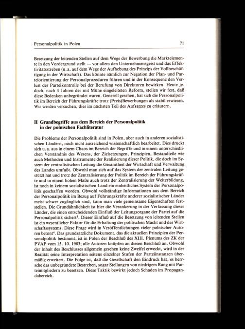 Die Probleme der Personalpolitik sind in Polen, aber auch in anderen sozialistischen Ländern, noch nicht ausreichend wissenschaftlich bearbeitet. Dies drückt sich u.a. aus in einem Chaos im Bereich der Begriffe und in einem unterschiedlichen Verständnis des Wesens, der Zielsetzungen, Prinzipien, Bestandteile wie auch Methoden und Instrumente der Realisierung dieser Politik, die doch im System der zentralistischen Leitung die Gesamtheit der Wirtschaft und Verwaltung des Landes umfaßt. Obwohl man sich auf das System der zentralen Leitung gestützt hat und trotz der Zentralisierung der Politik im Bereich der Führungskräfte und in einem hohen Maße auch trotz der Zentralisierung der Weiterbildung, ist noch in keinem sozialistischen Land ein einheitliches System der Personalpolitik geschaffen worden. Obwohl vollständige Informationen aus dem Bereich der Personalpolitik im Bezug auf Führungskräfte anderer sozialistischer Länder meist schwer zugänglich sind, kann man viele gemeinsame Eigenschaften feststellen. Die Grundähnlichkeit ist hier die Verankerung in der Verfassung dieser Länder, die einen entscheidenden Einfluß der Leitungsorgane der Partei auf die Personalpolitik sichert?. Dieser Einfluß auf die Besetzung von leitenden Stellen ist ein wesentlicher Faktor für die Erhaltung der politischen Macht und des Wirtschaftssystems. Diese Frage wird in Veröffentlichungen vieler polnischer Autoren betont“. Das grundsätzliche Dokument, das die aktuellen Prinzipien der Personalpolitik bestimmt, ist in Polen der Beschluß des XIII. Plenums des ZK der PVAP vom 15. 10. 1983; alle Autoren knüpfen an diesen Beschluß an. Obwohl der Inhalt des Beschlusses allgemein gesehen keine Zweifel erweckt, wird in der Realität seine Interpretation seitens einzelner Stufen der Parteiinstanzen übermäßig erweitert. Die Folge ist, daß die Gesellschaft den Eindruck hat, es herrsche das unbegründete Bestreben, sogar Stellungen von niedrigem Rang mit Parteimitgliedern zu besetzen. Diese Taktik bewirkt jedoch Schaden im Propagandabereich.