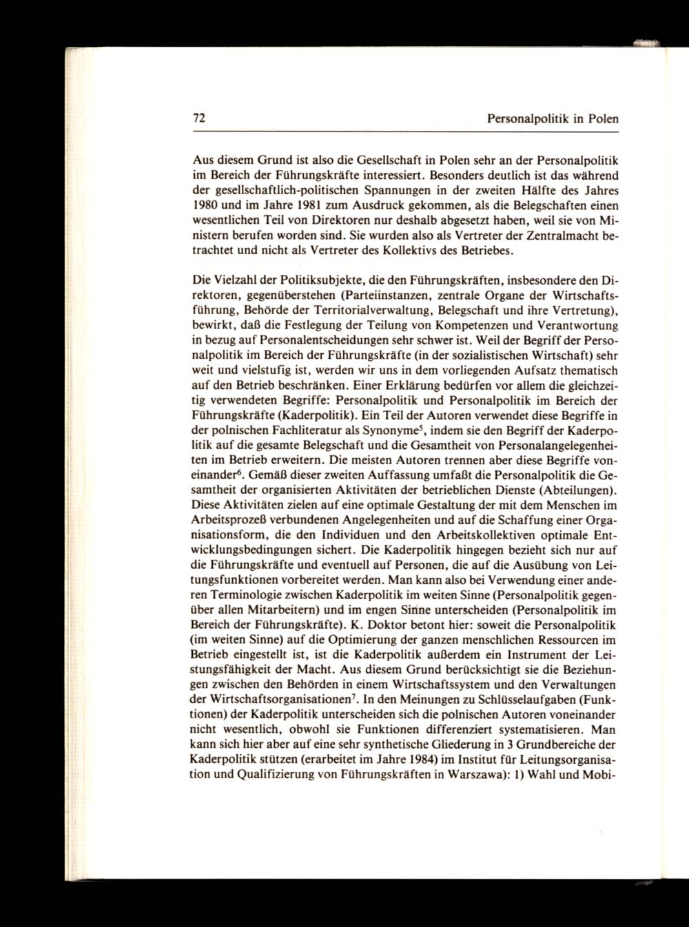 Die Vielzahl der Politiksubjekte, die den Führungskräften, insbesondere den Direktoren, gegenüberstehen(Parteiinstanzen, zentrale Organe der Wirtschaftsführung, Behörde der Territorialverwaltung, Belegschaft und ihre Vertretung), bewirkt, daß die Festlegung der Teilung von Kompetenzen und Verantwortung in bezug auf Personalentscheidungen sehr schwer ist. Weil der Begriff der Personalpolitik im Bereich der Führungskräfte(in der sozialistischen Wirtschaft) sehr weit und vielstufig ist, werden wir uns in dem vorliegenden Aufsatz thematisch auf den Betrieb beschränken. Einer Erklärung bedürfen vor allem die gleichzeitig verwendeten Begriffe: Personalpolitik und Personalpolitik im Bereich der Führungskräfte(Kaderpolitik). Ein Teil der Autoren verwendet diese Begriffe in der polnischen Fachliteratur als Synonyme‘, indem sie den Begriff der Kaderpolitik auf die gesamte Belegschaft und die Gesamtheit von Personalangelegenheiten im Betrieb erweitern. Die meisten Autoren trennen aber diese Begriffe voneinander®. Gemäß dieser zweiten Auffassung umfaßt die Personalpolitik die Gesamtheit der organisierten Aktivitäten der betrieblichen Dienste(Abteilungen). Diese Aktivitäten zielen auf eine optimale Gestaltung der mit dem Menschen im Arbeitsprozeß verbundenen Angelegenheiten und auf die Schaffung einer Organisationsform, die den Individuen und den Arbeitskollektiven optimale Entwicklungsbedingungen sichert. Die Kaderpolitik hingegen bezieht sich nur auf die Führungskräfte und eventuell auf Personen, die auf die Ausübung von Leitungsfunktionen vorbereitet werden. Man kann also bei Verwendung einer anderen Terminologie zwischen Kaderpolitik im weiten Sinne(Personalpolitik gegenüber allen Mitarbeitern) und im engen Sinne unterscheiden(Personalpolitik im Bereich der Führungskräfte). K. Doktor betont hier: soweit die Personalpolitik (im weiten Sinne) auf die Optimierung der ganzen menschlichen Ressourcen im Betrieb eingestellt ist, ist die Kaderpolitik außerdem ein Instrument der Leistungsfähigkeit der Macht. Aus diesem Grund berücksichtigt sie die Beziehungen zwischen den Behörden in einem Wirtschaftssystem und den Verwaltungen der Wirtschaftsorganisationen’. In den Meinungen zu Schlüsselaufgaben(Funktionen) der Kaderpolitik unterscheiden sich die polnischen Autoren voneinander nicht wesentlich, obwohl sie Funktionen differenziert systematisieren. Man kann sich hier aber auf eine sehr synthetische Gliederung in 3 Grundbereiche der Kaderpolitik stützen(erarbeitet im Jahre 1984) im Institut für Leitungsorganisation und Qualifizierung von Führungskräften in Warszawa): 1) Wahl und Mobi