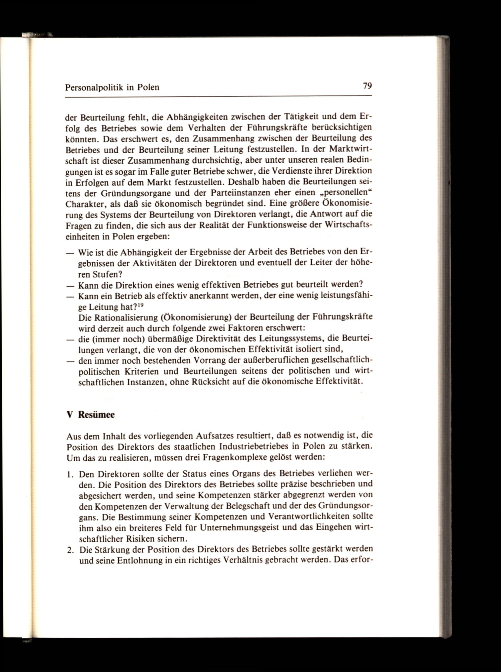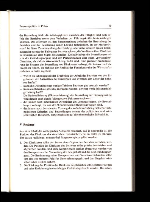 der Beurteilung fehlt, die Abhängigkeiten zwischen der Tätigkeit und dem Erfolg des Betriebes sowie dem Verhalten der Führungskräfte berücksichtigen könnten. Das erschwert es, den Zusammenhang zwischen der Beurteilung des Betriebes und der Beurteilung seiner Leitung festzustellen. In der Marktwirtschaft ist dieser Zusammenhang durchsichtig, aber unter unseren realen Bedingungen ist es sogar im Falle guter Betriebe schwer, die Verdienste ihrer Direktion in Erfolgen auf dem Markt festzustellen. Deshalb haben die Beurteilungen seitens der Gründungsorgane und der Parteiinstanzen eher einen„personellen“ Charakter, als daß sie ökonomisch begründet sind. Eine größere Ökonomisierung des Systems der Beurteilung von Direktoren verlangt, die Antwort auf die Fragen zu finden, die sich aus der Realität der Funktionsweise der Wirtschaftseinheiten in Polen ergeben: