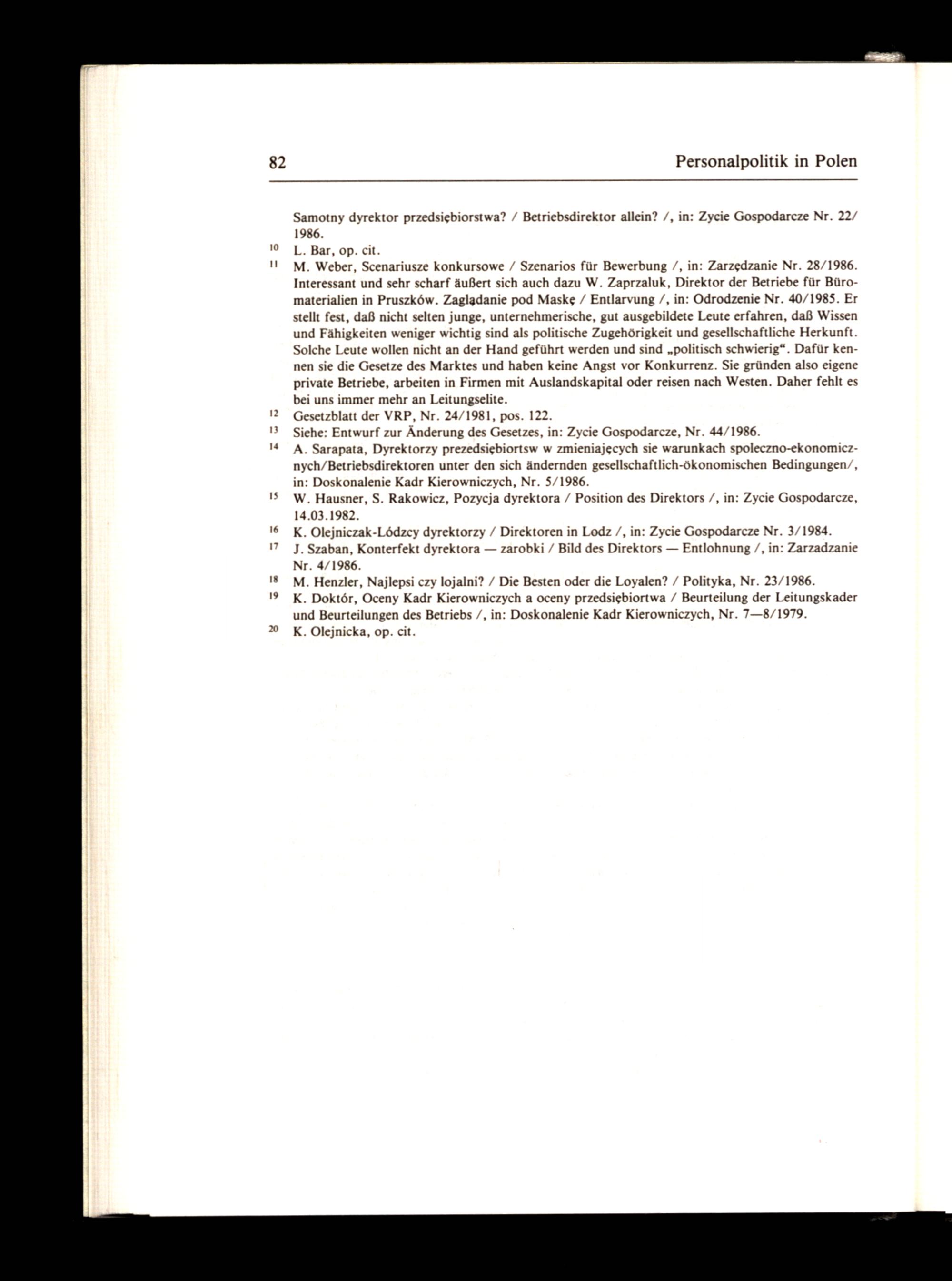 !ı._ M. Weber, Scenariusze konkursowe/ Szenarios für Bewerbung /, in: Zarzedzanie Nr. 28/1986. Interessant und sehr scharf äußert sich auch dazu W. Zaprzaluk, Direktor der Betriebe für Büromaterialien in Pruszköw. Zagladanie pod Maske/ Entlarvung /, in: Odrodzenie Nr. 40/1985. Er stellt fest, daß nicht selten junge, unternehmerische, gut ausgebildete Leute erfahren, daß Wissen und Fähigkeiten weniger wichtig sind als politische Zugehörigkeit und gesellschaftliche Herkunft. Solche Leute wollen nicht an der Hand geführt werden und sind„politisch schwierig“. Dafür kennen sie die Gesetze des Marktes und haben keine Angst vor Konkurrenz. Sie gründen also eigene private Betriebe, arbeiten in Firmen mit Auslandskapital oder reisen nach Westen. Daher fehlt es bei uns immer mehr an Leitungselite.