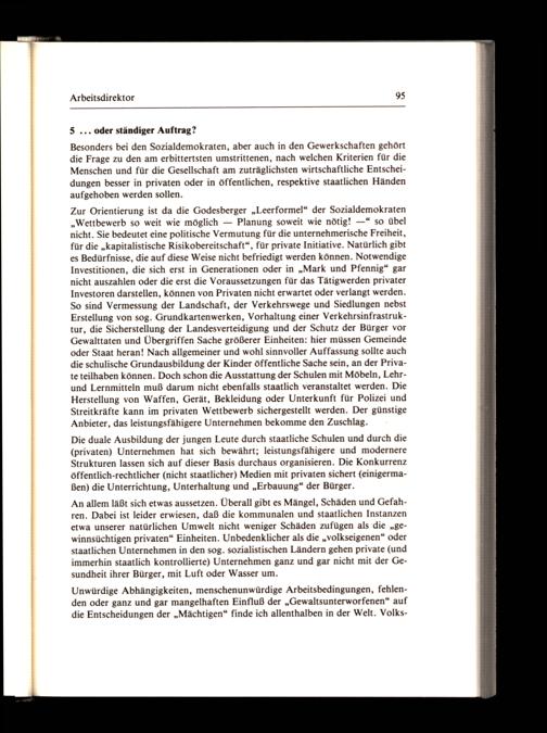 Zur Orientierung ist da die Godesberger„Leerformel“ der Sozialdemokraten „Wettbewerb so weit wie möglich— Planung soweit wie nötig!—“ so übel nicht. Sie bedeutet eine politische Vermutung für die unternehmerische Freiheit, für die„kapitalistische Risikobereitschaft“, für private Initiative. Natürlich gibt es Bedürfnisse, die auf diese Weise nicht befriedigt werden können. Notwendige Investitionen, die sich erst in Generationen oder in„Mark und Pfennig“ gar nicht auszahlen oder die erst die Voraussetzungen für das Tätigwerden privater Investoren darstellen, können von Privaten nicht erwartet oder verlangt werden. So sind Vermessung der Landschaft, der Verkehrswege und Siedlungen nebst Erstellung von sog. Grundkartenwerken, Vorhaltung einer Verkehrsinfrastruktur, die Sicherstellung der Landesverteidigung und der Schutz der Bürger vor Gewalttaten und Übergriffen Sache größerer Einheiten: hier müssen Gemeinde oder Staat heran! Nach allgemeiner und wohl sinnvoller Auffassung sollte auch die schulische Grundausbildung der Kinder öffentliche Sache sein, an der Private teilhaben können. Doch schon die Ausstattung der Schulen mit Möbeln, Lehrund Lernmitteln muß darum nicht ebenfalls staatlich veranstaltet werden. Die Herstellung von Waffen, Gerät, Bekleidung oder Unterkunft für Polizei und Streitkräfte kann im privaten Wettbewerb sichergestellt werden. Der günstige Anbieter, das leistungsfähigere Unternehmen bekomme den Zuschlag.