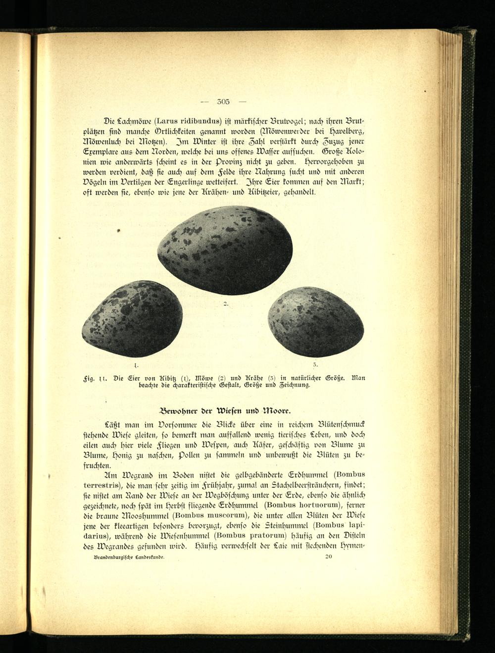 Die Lachmöwe (Harns rickibnnckus) ist märkischer Brutvogel; nach ihren Brutplätzen sind manche (Örtlichkeiten genannt worden (Möwenwerder bei Havelberg, Möwenluch bei Motzen), Im Winter ist ihre Zahl verstärkt durch Zuzug jener Exemplare aus dem Norden, welche bei uns offenes Wasser aussuchen. Große Kolonien wie anderwärts scheint es in der Provinz nicht zu geben, Hervorgehoben zu werden verdient, daß sie auch auf dem Heide ihre Nahrung sucht und mit anderen Vögeln im Vertilgen der Engerlinge wetteifert. Ihre Eier kommen auf den Markt; oft werden sie, ebenso wie jene der Krähen- und Kibitzeier, gehandelt.
