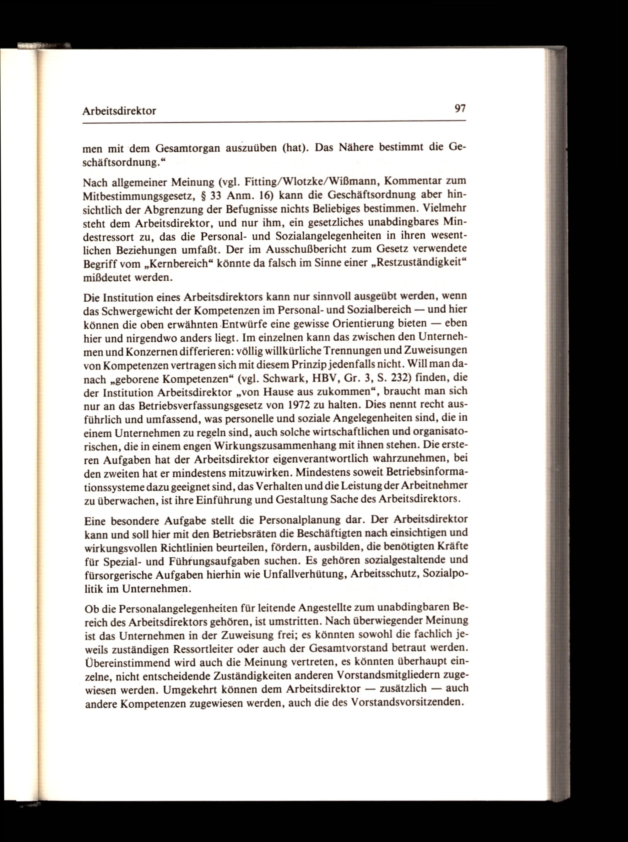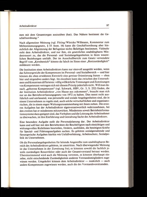 Ob die Personalangelegenheiten für leitende Angestellte zum unabdingbaren Bereich des Arbeitsdirektors gehören, ist umstritten. Nach überwiegender Meinung ist das Unternehmen in der Zuweisung frei; es könnten sowohl die fachlich jeweils zuständigen Ressortleiter oder auch der Gesamtvorstand betraut werden. Übereinstimmend wird auch die Meinung vertreten, es könnten überhaupt einzelne, nicht entscheidende Zuständigkeiten anderen Vorstandsmitgliedern zugewiesen werden. Umgekehrt können dem Arbeitsdirektor— zusätzlich— auch andere Kompetenzen zugewiesen werden, auch die des Vorstandsvorsitzenden.