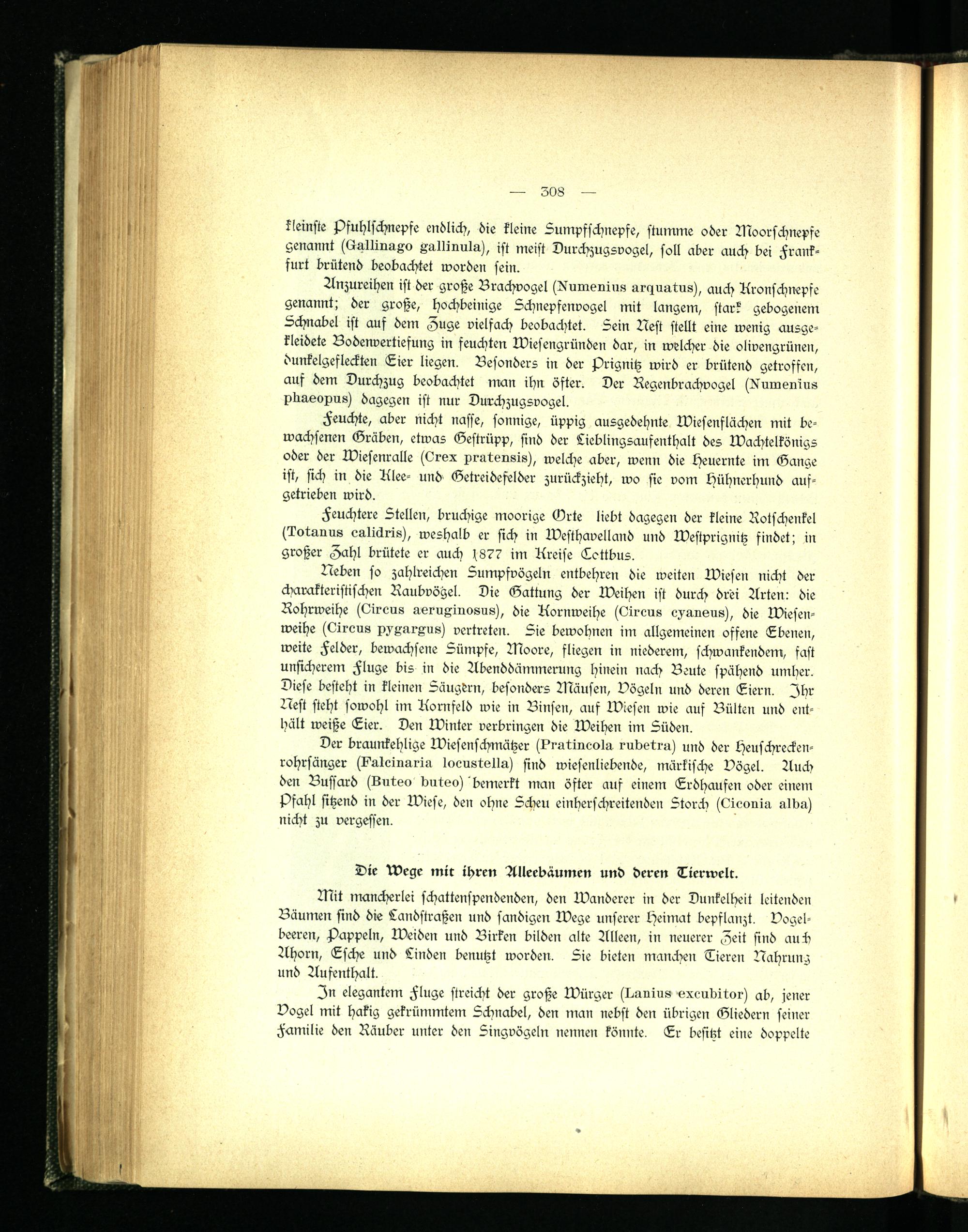 Mit mancherlei schattenspendenden, den Wanderer in der Dunkelheit leitenden Bäumen sind die Landstraßen und sandigen Wege unserer Heimat bepflanzt. Vogelbeeren, Pappeln, Weiden und Birken bilden alte Alleen, in neuerer Zeit sind auck Ahorn, Esche und Linden benutzt worden. Sie bieten manchen Tieren Nahrung und Aufenthalt.