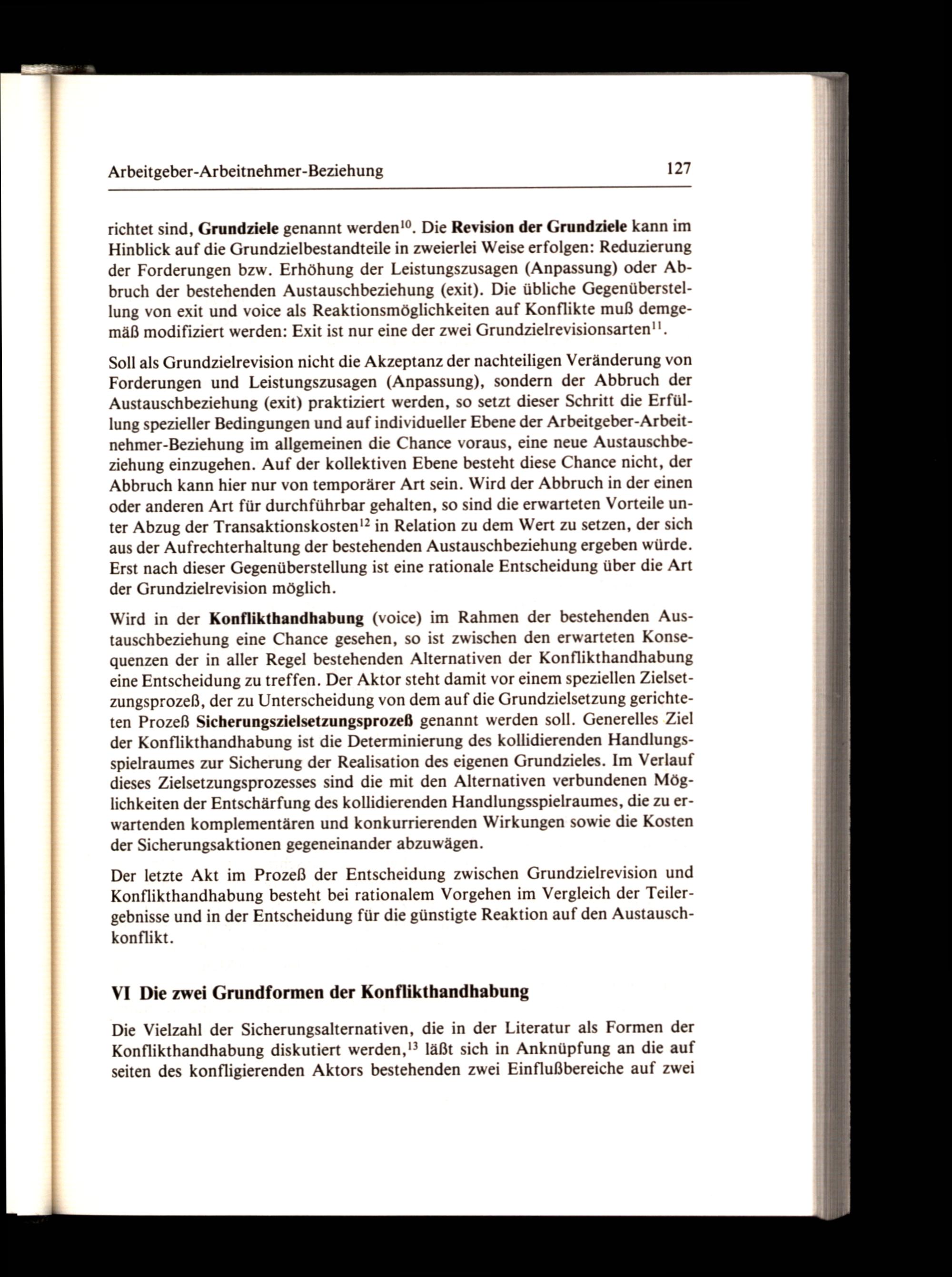 Soll als Grundzielrevision nicht die Akzeptanz der nachteiligen Veränderung von Forderungen und Leistungszusagen(Anpassung), sondern der Abbruch der Austauschbeziehung(exit) praktiziert werden, so setzt dieser Schritt die Erfüllung spezieller Bedingungen und auf individueller Ebene der Arbeitgeber-Arbeitnehmer-Beziehung im allgemeinen die Chance voraus, eine neue Austauschbeziehung einzugehen. Auf der kollektiven Ebene besteht diese Chance nicht, der Abbruch kann hier nur von temporärer Art sein. Wird der Abbruch in der einen oder anderen Art für durchführbar gehalten, so sind die erwarteten Vorteile unter Abzug der Transaktionskosten!? in Relation zu dem Wert zu setzen, der sich aus der Aufrechterhaltung der bestehenden Austauschbeziehung ergeben würde. Erst nach dieser Gegenüberstellung ist eine rationale Entscheidung über die Art der Grundzielrevision möglich.