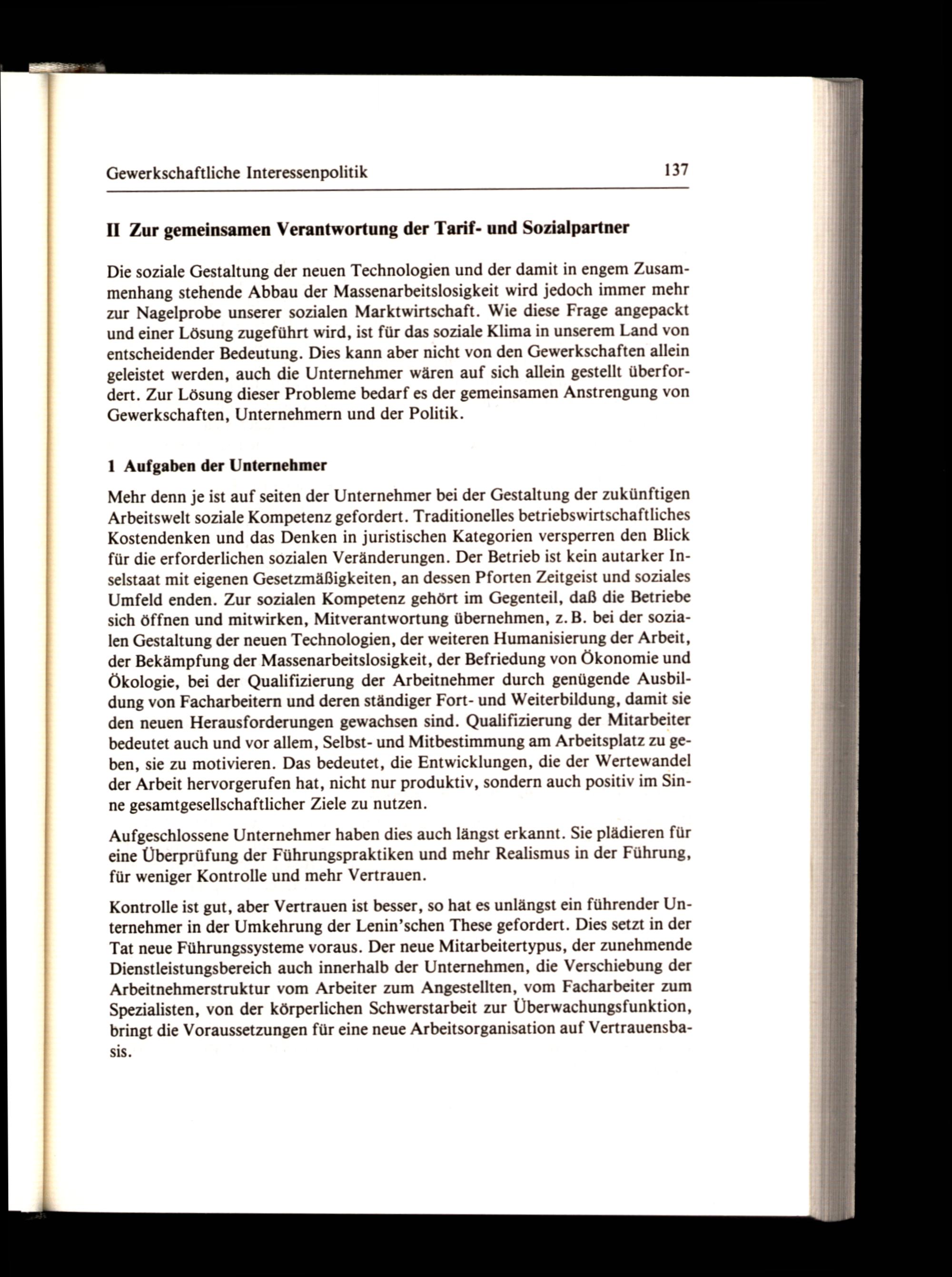 Mehr denn je ist auf seiten der Unternehmer bei der Gestaltung der zukünftigen Arbeitswelt soziale Kompetenz gefordert. Traditionelles betriebswirtschaftliches Kostendenken und das Denken in juristischen Kategorien versperren den Blick für die erforderlichen sozialen Veränderungen. Der Betrieb ist kein autarker Inselstaat mit eigenen Gesetzmäßigkeiten, an dessen Pforten Zeitgeist und soziales Umfeld enden. Zur sozialen Kompetenz gehört im Gegenteil, daß die Betriebe sich öffnen und mitwirken, Mitverantwortung übernehmen, z.B. bei der sozialen Gestaltung der neuen Technologien, der weiteren Humanisierung der Arbeit, der Bekämpfung der Massenarbeitslosigkeit, der Befriedung von Ökonomie und Ökologie, bei der Qualifizierung der Arbeitnehmer durch genügende Ausbildung von Facharbeitern und deren ständiger Fort- und Weiterbildung, damit sie den neuen Herausforderungen gewachsen sind. Qualifizierung der Mitarbeiter bedeutet auch und vor allem, Selbst- und Mitbestimmung am Arbeitsplatz zu geben, sie zu motivieren. Das bedeutet, die Entwicklungen, die der Wertewandel der Arbeit hervorgerufen hat, nicht nur produktiv, sondern auch positiv im Sinne gesamtgesellschaftlicher Ziele zu nutzen.