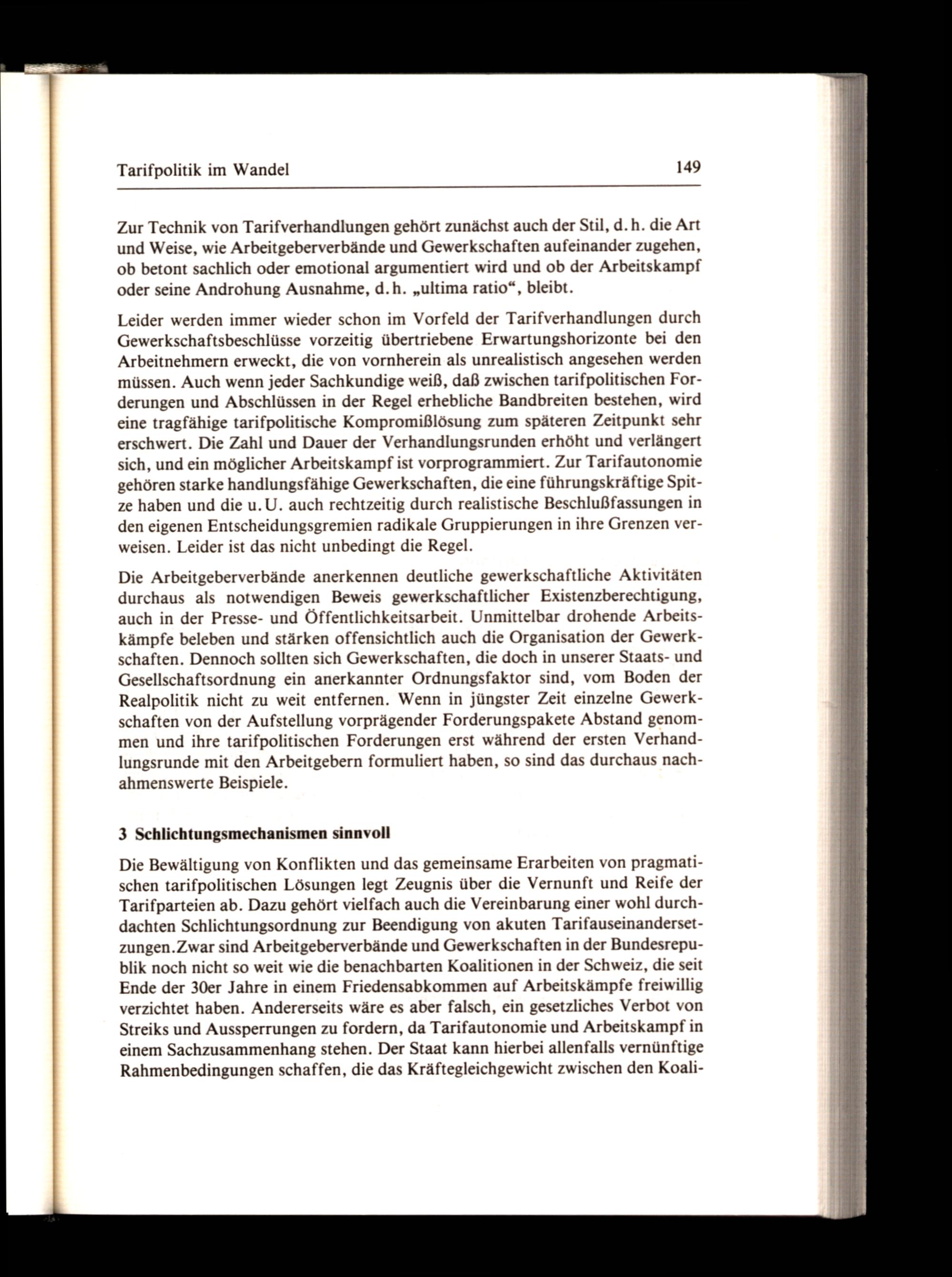 Die Bewältigung von Konflikten und das gemeinsame Erarbeiten von pragmatischen tarifpolitischen Lösungen legt Zeugnis über die Vernunft und Reife der Tarifparteien ab. Dazu gehört vielfach auch die Vereinbarung einer wohl durchdachten Schlichtungsordnung zur Beendigung von akuten Tarifauseinandersetzungen.Zwar sind Arbeitgeberverbände und Gewerkschaften in der Bundesrepublik noch nicht so weit wie die benachbarten Koalitionen in der Schweiz, die seit Ende der 30er Jahre in einem Friedensabkommen auf Arbeitskämpfe freiwillig verzichtet haben. Andererseits wäre es aber falsch, ein gesetzliches Verbot von Streiks und Aussperrungen zu fordern, da Tarifautonomie und Arbeitskampf in einem Sachzusammenhang stehen. Der Staat kann hierbei allenfalls vernünftige Rahmenbedingungen schaffen, die das Kräftegleichgewicht zwischen den Koali