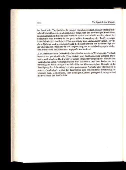 Z. Zt. stehen auch die Gewerkschaften offenbar an einem Wendepunkt. Vielfach beherrschen parteipolitische Einseitigkeit und Radikalisierung einzelne Industriegewerkschaften. Die Furcht vor einem Mitgliederrückgang läßt manche Gewerkschaften einen verhängnisvollen Kurs ansteuern. Auf dem Boden der Arbeitslosigkeit kann kein gutes sozialpolitisches Klima entstehen. Deshalb ist die Beseitigung der Arbeitslosigkeit eine gemeinsame Aufgabe aller Beteiligten in unserer Gesellschaft, wobei der Tarifpolitik eine entscheidende Bedeutung zukommen muß. Gemeinsame, vom allseitigen Konsens getragene Lösungen sind die Prüfsteine der Tarifpolitik.