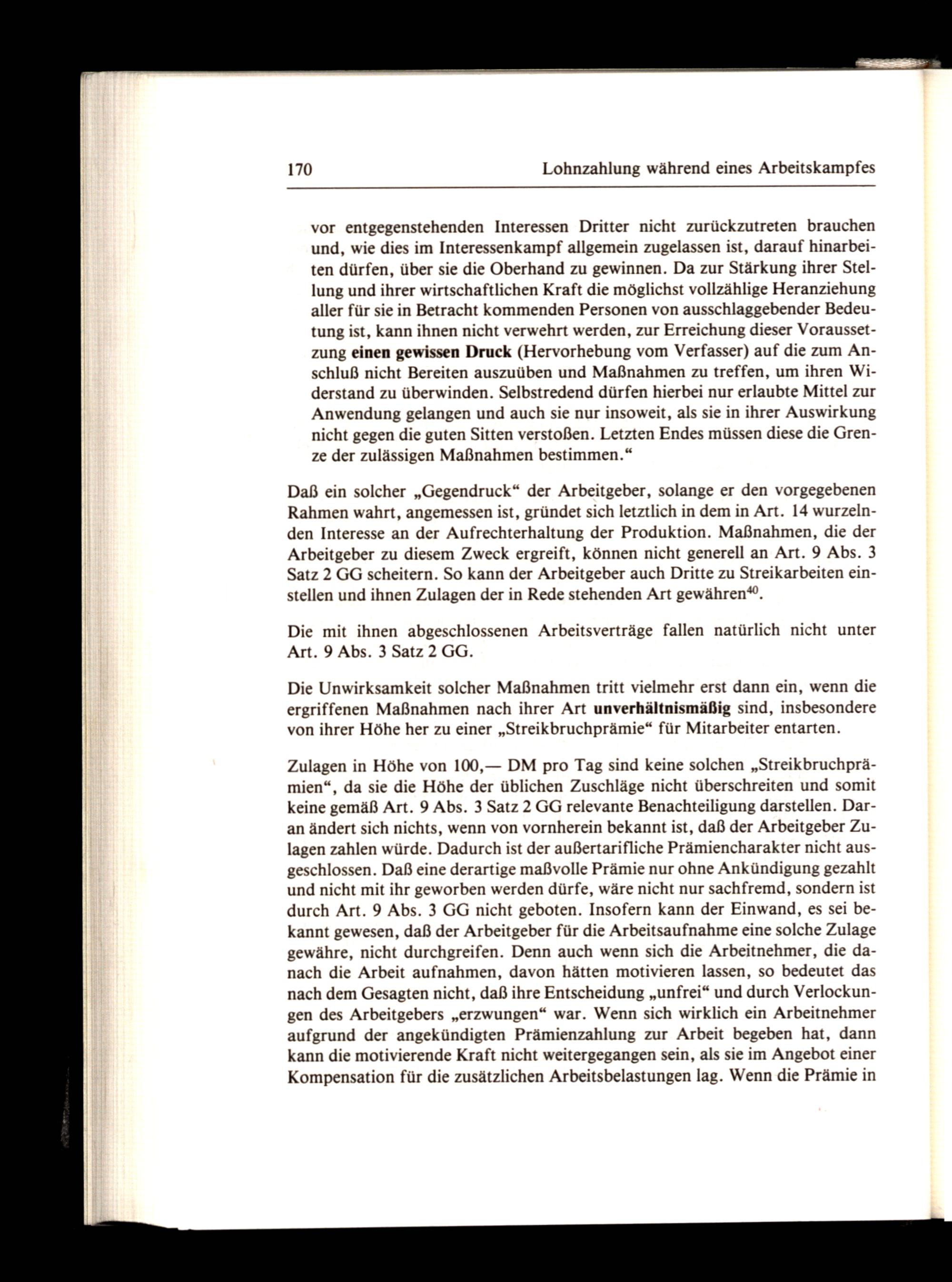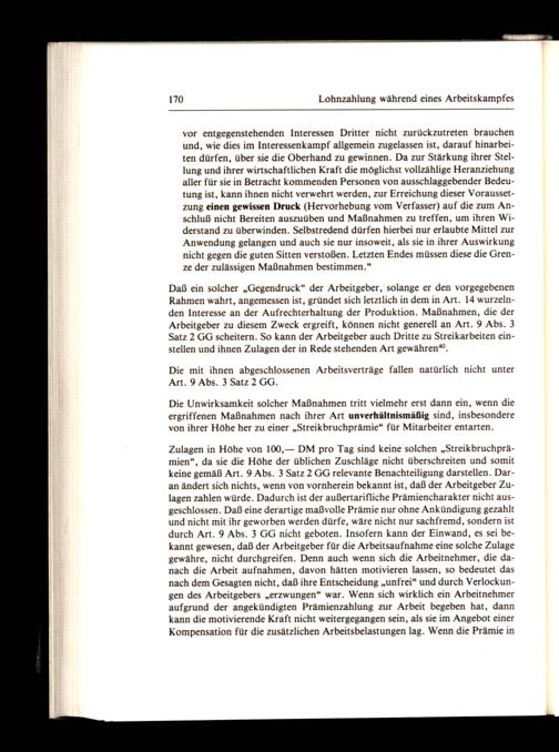 Daß ein solcher„Gegendruck“ der Arbeitgeber, solange er den vorgegebenen Rahmen wahrt, angemessen ist, gründet sich letztlich in dem in Art. 14 wurzelnden Interesse an der Aufrechterhaltung der Produktion. Maßnahmen, die der Arbeitgeber zu diesem Zweck ergreift, können nicht generell an Art. 9 Abs. 3 Satz 2 GG scheitern. So kann der Arbeitgeber auch Dritte zu Streikarbeiten einstellen und ihnen Zulagen der in Rede stehenden Art gewähren“.