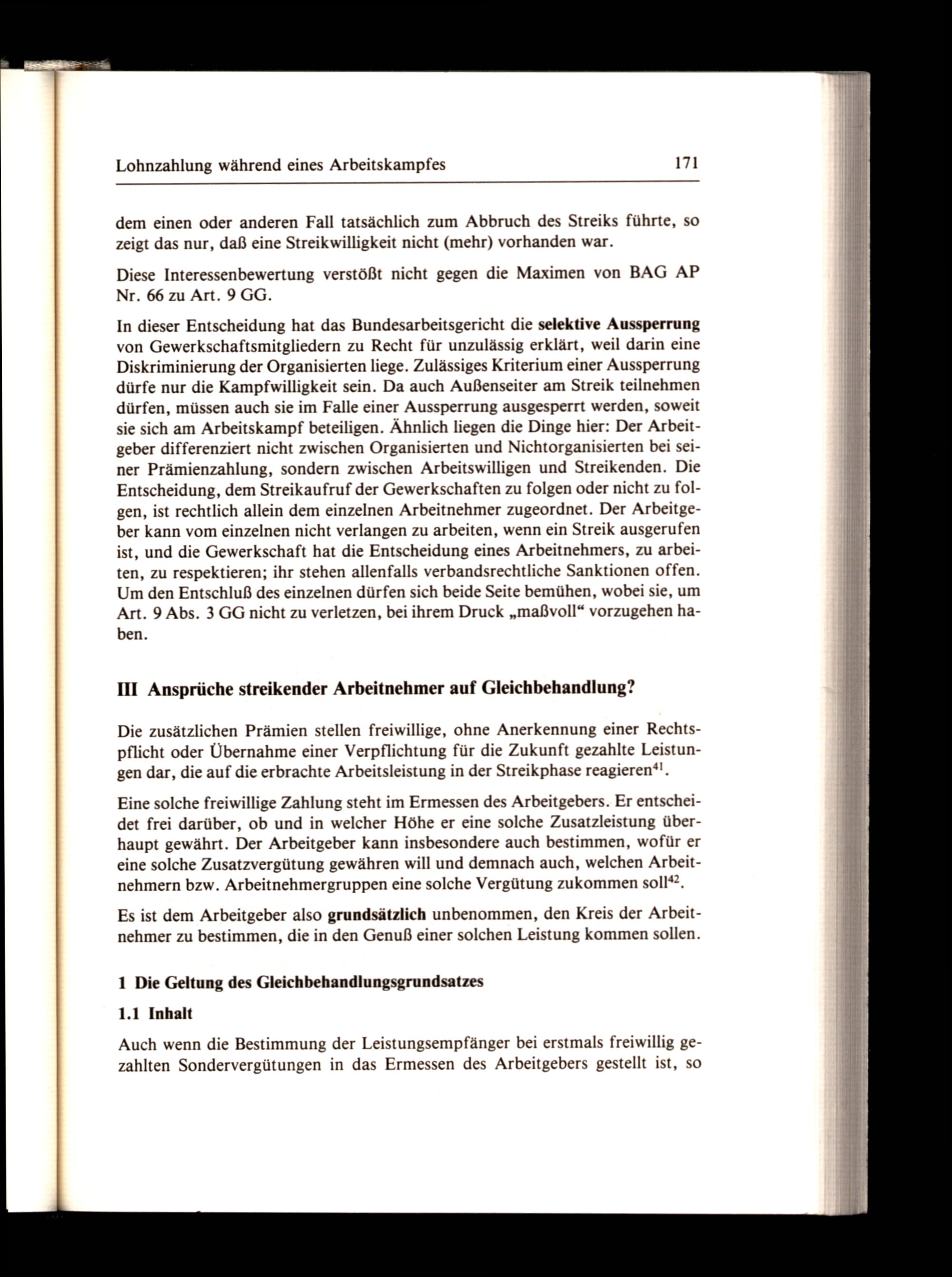 In dieser Entscheidung hat das Bundesarbeitsgericht die selektive Aussperrung von Gewerkschaftsmitgliedern zu Recht für unzulässig erklärt, weil darin eine Diskriminierung der Organisierten liege. Zulässiges Kriterium einer Aussperrung dürfe nur die Kampfwilligkeit sein. Da auch Außenseiter am Streik teilnehmen dürfen, müssen auch sie im Falle einer Aussperrung ausgesperrt werden, soweit sie sich am Arbeitskampf beteiligen. Ähnlich liegen die Dinge hier: Der Arbeitgeber differenziert nicht zwischen Organisierten und Nichtorganisierten bei seiner Prämienzahlung, sondern zwischen Arbeitswilligen und Streikenden. Die Entscheidung, dem Streikaufruf der Gewerkschaften zu folgen oder nicht zu folgen, ist rechtlich allein dem einzelnen Arbeitnehmer zugeordnet. Der Arbeitgeber kann vom einzelnen nicht verlangen zu arbeiten, wenn ein Streik ausgerufen ist, und die Gewerkschaft hat die Entscheidung eines Arbeitnehmers, zu arbeiten, zu respektieren; ihr stehen allenfalls verbandsrechtliche Sanktionen offen. Um den Entschluß des einzelnen dürfen sich beide Seite bemühen, wobei sie, um Art. 9 Abs. 3 GG nicht zu verletzen, bei ihrem Druck„maßvoll“ vorzugehen haben.