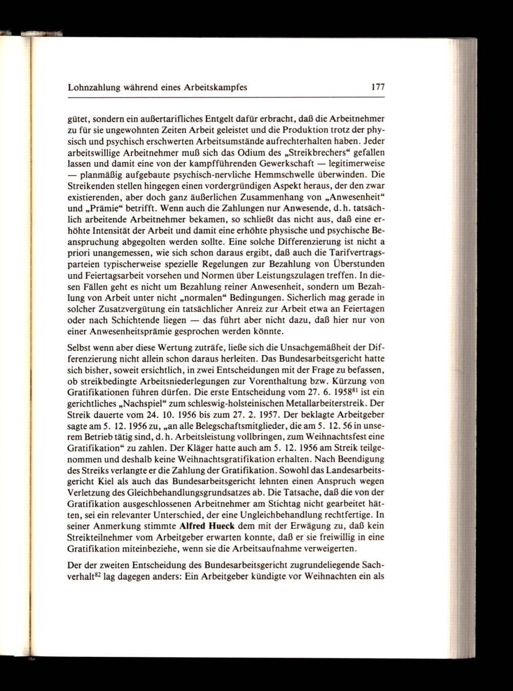 Selbst wenn aber diese Wertung zuträfe, ließe sich die Unsachgemäßheit der Differenzierung nicht allein schon daraus herleiten. Das Bundesarbeitsgericht hatte sich bisher, soweit ersichtlich, in zwei Entscheidungen mit der Frage zu befassen, ob streikbedingte Arbeitsniederlegungen zur Vorenthaltung bzw. Kürzung. von Gratifikationen führen dürfen. Die erste Entscheidung vom 27. 6. 19588! ist ein gerichtliches„Nachspiel“ zum schleswig-holsteinischen Metallarbeiterstreik. Der Streik dauerte vom 24. 10. 1956 bis zum 27. 2. 1957. Der beklagte Arbeitgeber sagte am 5. 12. 1956 zu,„an alle Belegschaftsmitglieder, die am 5. 12. 56 in unserem Betrieb tätig sind, d.h. Arbeitsleistung vollbringen, zum Weihnachtsfest eine Gratifikation“ zu zahlen. Der Kläger hatte auch am 5. 12. 1956 am Streik teilgenommen und deshalb keine Weihnachtsgratifikation erhalten. Nach Beendigung des Streiks verlangte er die Zahlung der Gratifikation. Sowohl das Landesarbeitsgericht Kiel als auch das Bundesarbeitsgericht lehnten einen Anspruch wegen Verletzung des Gleichbehandlungsgrundsatzes ab. Die Tatsache, daß die von der Gratifikation ausgeschlossenen Arbeitnehmer am Stichtag nicht gearbeitet hätten, sei ein relevanter Unterschied, der eine Ungleichbehandlung rechtfertige. In seiner Anmerkung stimmte Alfred Hueck dem mit der Erwägung zu, daß kein Streikteilnehmer vom Arbeitgeber erwarten konnte, daß er sie freiwillig in eine Gratifikation miteinbeziehe, wenn sie die Arbeitsaufnahme verweigerten.