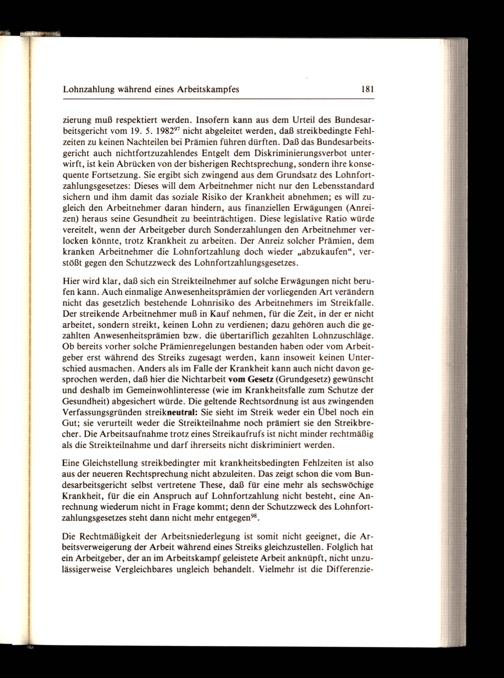 Hier wird klar, daß sich ein Streikteilnehmer auf solche Erwägungen nicht berufen kann. Auch einmalige Anwesenheitsprämien der vorliegenden Art verändern nicht das gesetzlich bestehende Lohnrisiko des Arbeitnehmers im Streikfalle. Der streikende Arbeitnehmer muß in Kauf nehmen, für die Zeit, in der er nicht arbeitet, sondern streikt, keinen Lohn zu verdienen; dazu gehören auch die gezahlten Anwesenheitsprämien bzw. die übertariflich gezahlten Lohnzuschläge. Ob bereits vorher solche Prämienregelungen bestanden haben oder vom Arbeitgeber erst während des Streiks zugesagt werden, kann insoweit keinen Unterschied ausmachen. Anders als im Falle der Krankheit kann auch nicht davon gesprochen werden, daß hier die Nichtarbeit vom Gesetz(Grundgesetz) gewünscht und deshalb im Gemeinwohlinteresse(wie im Krankheitsfalle zum Schutze der Gesundheit) abgesichert würde. Die geltende Rechtsordnung ist aus zwingenden Verfassungsgründen streikneutral: Sie sieht im Streik weder ein Übel noch ein Gut; sie verurteilt weder die Streikteilnahme noch prämiert sie den Streikbrecher. Die Arbeitsaufnahme trotz eines Streikaufrufs ist nicht minder rechtmäßig als die Streikteilnahme und darf ihrerseits nicht diskriminiert werden.