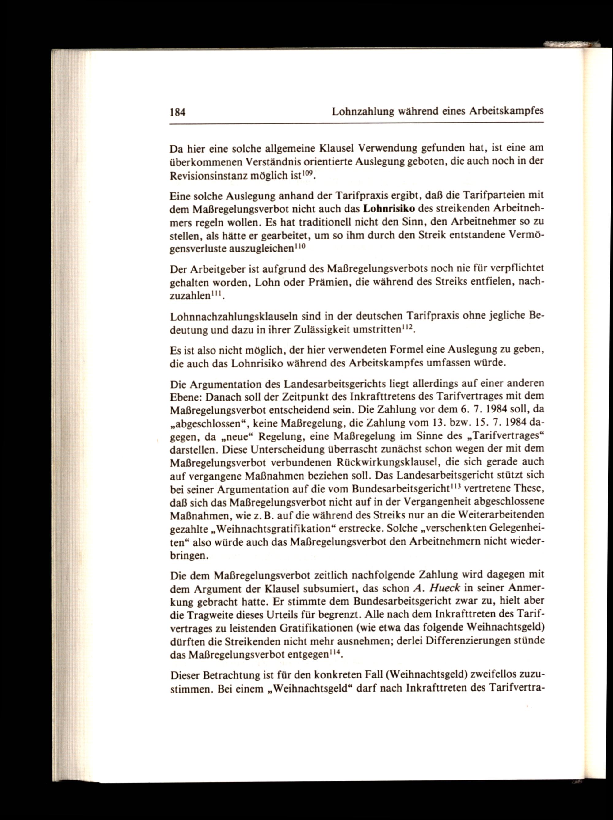 Die Argumentation des Landesarbeitsgerichts liegt allerdings auf einer anderen Ebene: Danach soll der Zeitpunkt des Inkrafttretens des Tarifvertrages mit dem Maßregelungsverbot entscheidend sein. Die Zahlung vor dem 6. 7. 1984 soll, da „abgeschlossen“, keine Maßregelung, die Zahlung vom 13. bzw. 15. 7. 1984 dagegen, da„neue“ Regelung, eine Maßregelung im Sinne des„Tarifvertrages“ darstellen. Diese Unterscheidung überrascht zunächst schon wegen der mit dem Maßregelungsverbot verbundenen Rückwirkungsklausel, die sich gerade auch auf vergangene Maßnahmen beziehen soll. Das Landesarbeitsgericht stützt sich bei seiner Argumentation auf die vom Bundesarbeitsgericht!!? vertretene These, daß sich das Maßregelungsverbot nicht auf in der Vergangenheit abgeschlossene Maßnahmen, wie z. B. auf die während des Streiks nur an die Weiterarbeitenden gezahlte„Weihnachtsgratifikation“ erstrecke. Solche„verschenkten Gelegenheiten“ also würde auch das Maßregelungsverbot den Arbeitnehmern nicht wiederbringen.