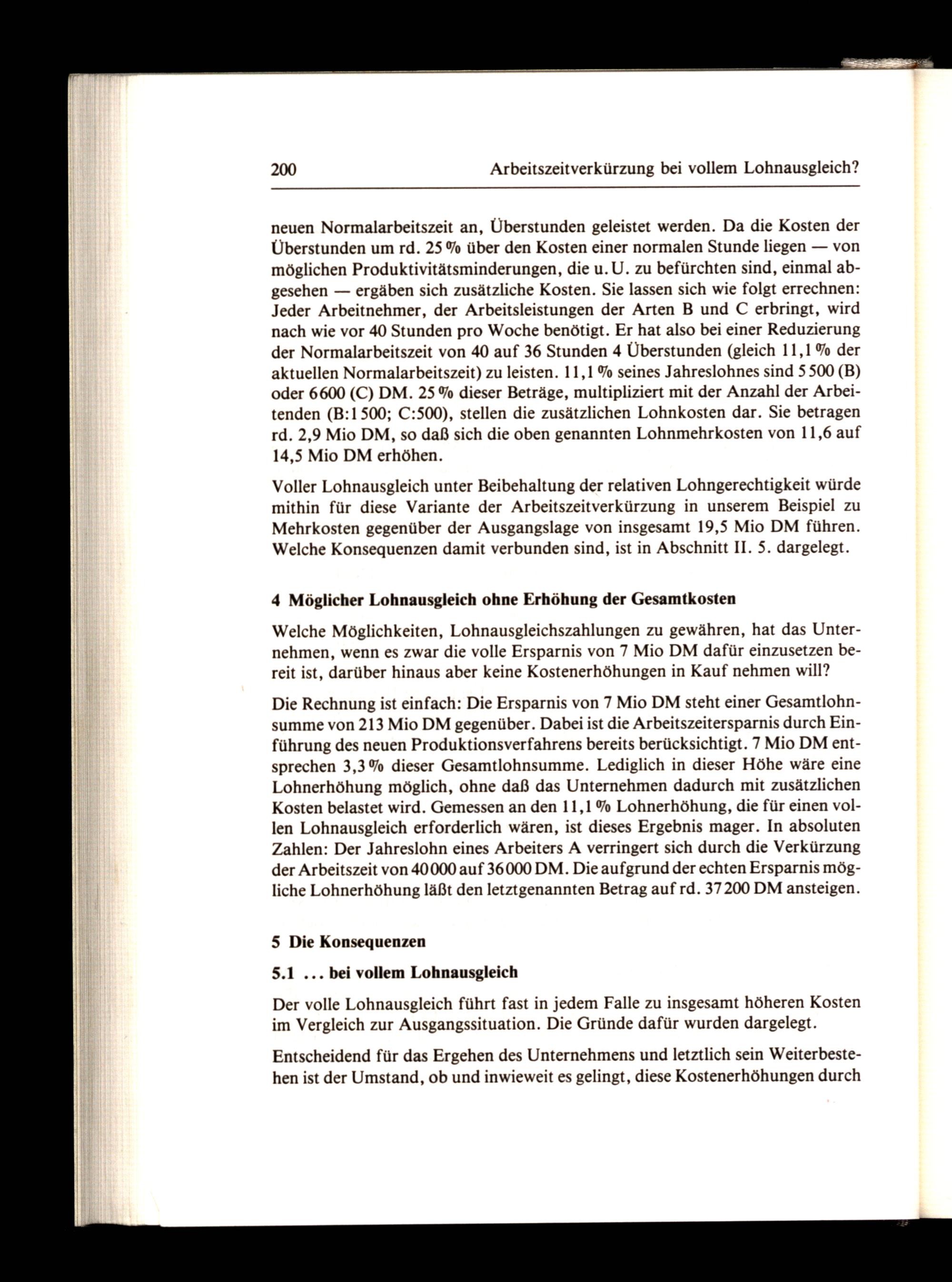 Voller Lohnausgleich unter Beibehaltung der relativen Lohngerechtigkeit würde mithin für diese Variante der Arbeitszeitverkürzung in unserem Beispiel zu Mehrkosten gegenüber der Ausgangslage von insgesamt 19,5 Mio DM führen. Welche Konsequenzen damit verbunden sind, ist in Abschnitt II. 5. dargelegt.