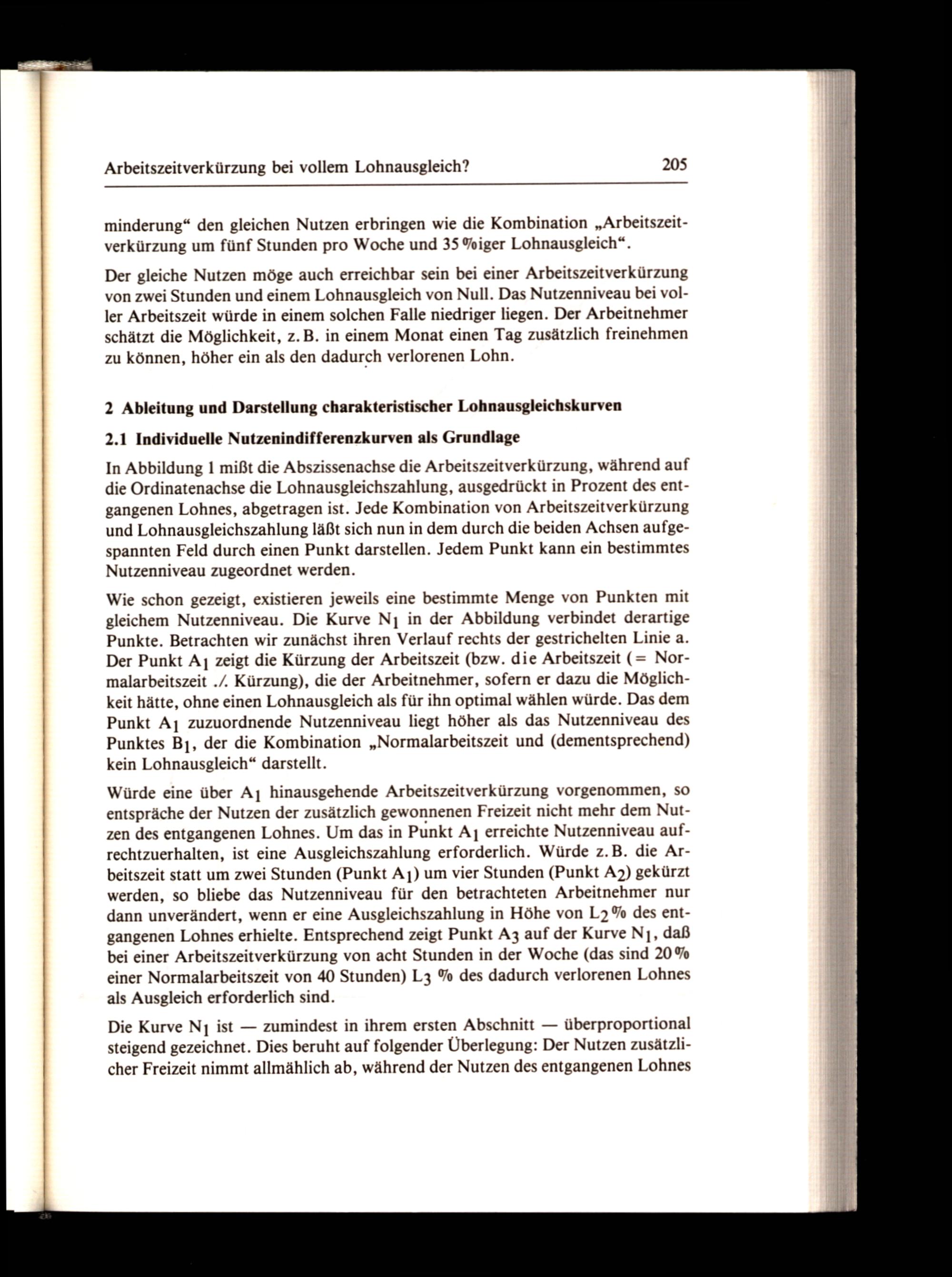 Würde eine über Ay hinausgehende Arbeitszeitverkürzung vorgenommen, SO entspräche der Nutzen der zusätzlich gewonnenen Freizeit nicht mehr dem Nutzen des entgangenen Lohnes. Um das in Punkt Ay erreichte Nutzenniveau aufrechtzuerhalten, ist eine Ausgleichszahlung erforderlich. Würde z.B. die Arbeitszeit statt um zwei Stunden(Punkt A1) um vier Stunden(Punkt A2) gekürzt werden, so bliebe das Nutzenniveau für den betrachteten Arbeitnehmer nur dann unverändert, wenn er eine Ausgleichszahlung in Höhe von L2% des entgangenen Lohnes erhielte. Entsprechend zeigt Punkt A3 auf der Kurve Nj, daß bei einer Arbeitszeitverkürzung von acht Stunden in der Woche(das sind 20% einer Normalarbeitszeit von 40 Stunden) L3% des dadurch verlorenen Lohnes als Ausgleich erforderlich sind.