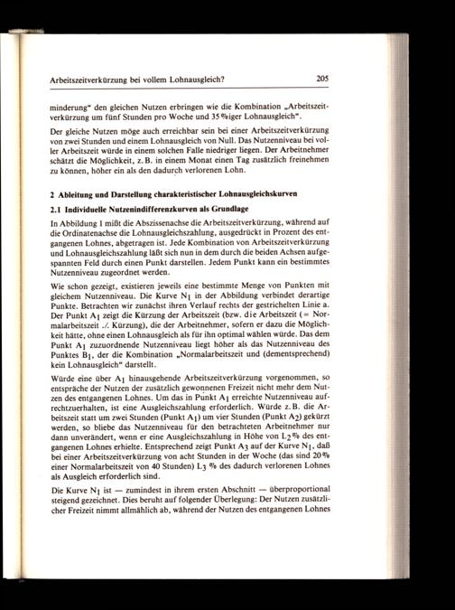 Der gleiche Nutzen möge auch erreichbar sein bei einer Arbeitszeitverkürzung von zwei Stunden und einem Lohnausgleich von Null. Das Nutzenniveau bei voller Arbeitszeit würde in einem solchen Falle niedriger liegen. Der Arbeitnehmer schätzt die Möglichkeit, z.B. in einem Monat einen Tag zusätzlich freinehmen zu können, höher ein als den dadurch verlorenen Lohn.