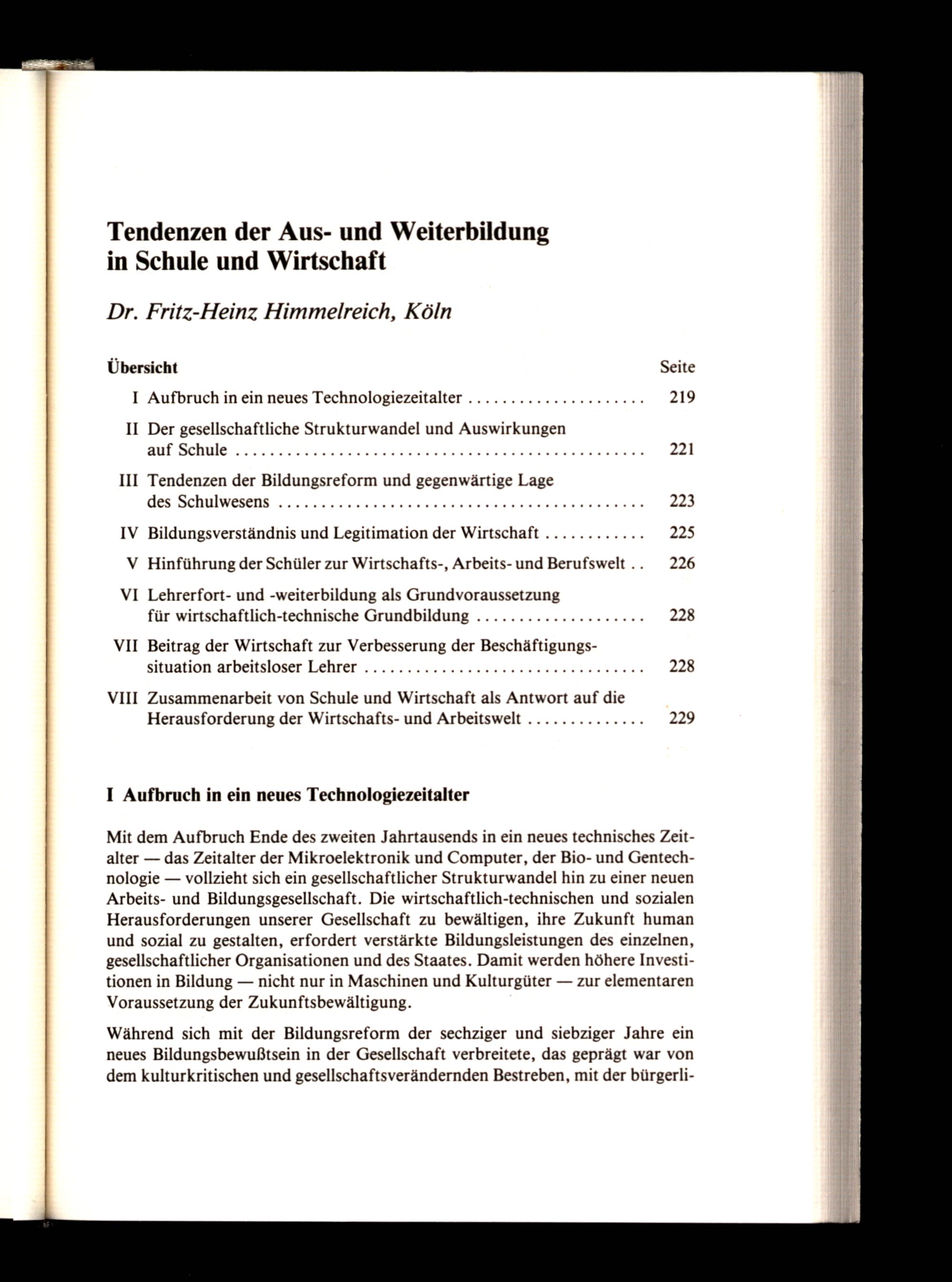 IV Bildungsverständnis und Legitimation der Wirtschaft V Hinführung der Schüler zur Wirtschafts-, Arbeits- und Berufswelt..