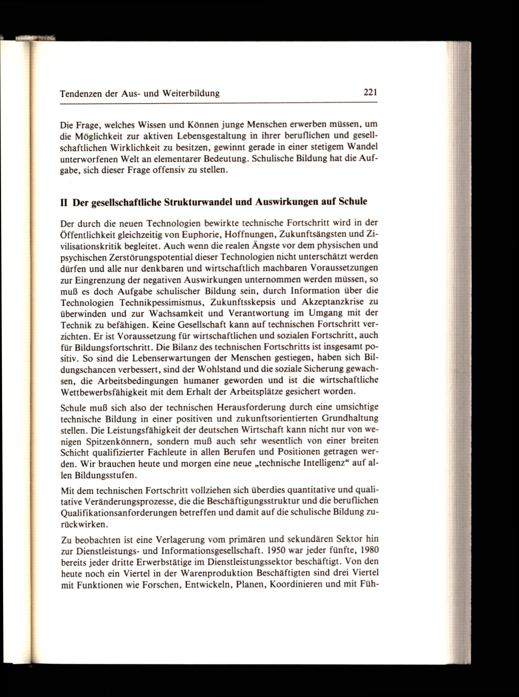 Mit dem technischen Fortschritt vollziehen sich überdies quantitative und qualitative Veränderungsprozesse, die die Beschäftigungsstruktur und die beruflichen Qualifikationsanforderungen betreffen und damit auf die schulische Bildung zurückwirken.