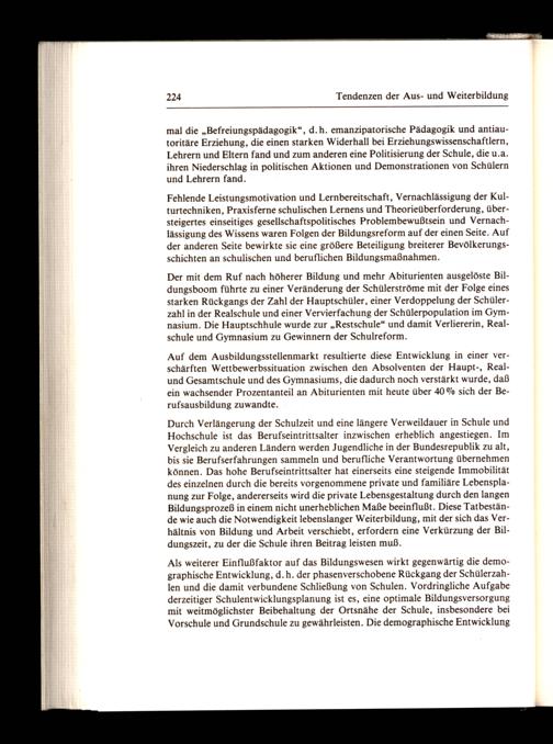 Fehlende Leistungsmotivation und Lernbereitschaft, Vernachlässigung der Kulturtechniken, Praxisferne schulischen Lernens und Theorieüberforderung, übersteigertes einseitiges gesellschaftspolitisches Problembewußtsein und Vernachlässigung des Wissens waren Folgen der Bildungsreform auf der einen Seite. Auf der anderen Seite bewirkte sie eine größere Beteiligung breiterer Bevölkerungsschichten an schulischen und beruflichen Bildungsmaßnahmen.