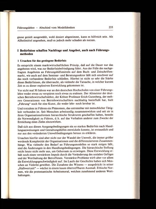 Vor nicht mal 30 Jahren war an den deutschen Hochschulen von einer Führungslehre weder etwas zu verspüren noch etwas zu erahnen. Der Altmeister der deutschen Betriebswirtschaftslehre, der Kölner Professor Erich Gutenberg, der mehrere Generationen von Betriebswirtschaftlern nachhaltig beeinflußt hat, hielt „Führung“ noch für eine Kunst, die weder lehr- noch lernbar ist.