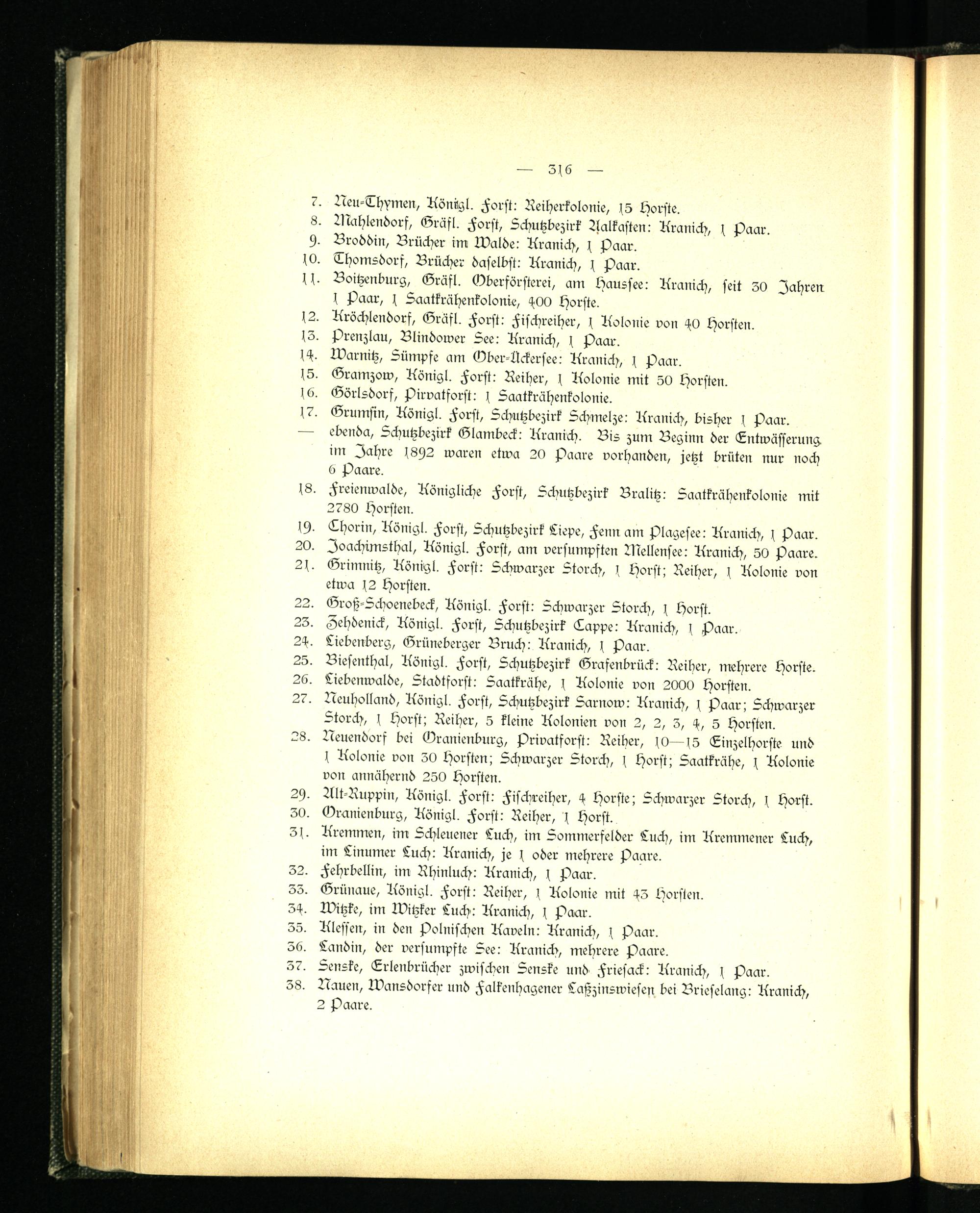 28. Neuendorf bei Oranienburg, Privatforst: Reiher, > 0—>5 Tinzelhorste und s Kolonie von 30 Horsten; Schwarzer Storch, s Horst; Saatkrähe, s Kolonie von annähernd 250 Horsten.