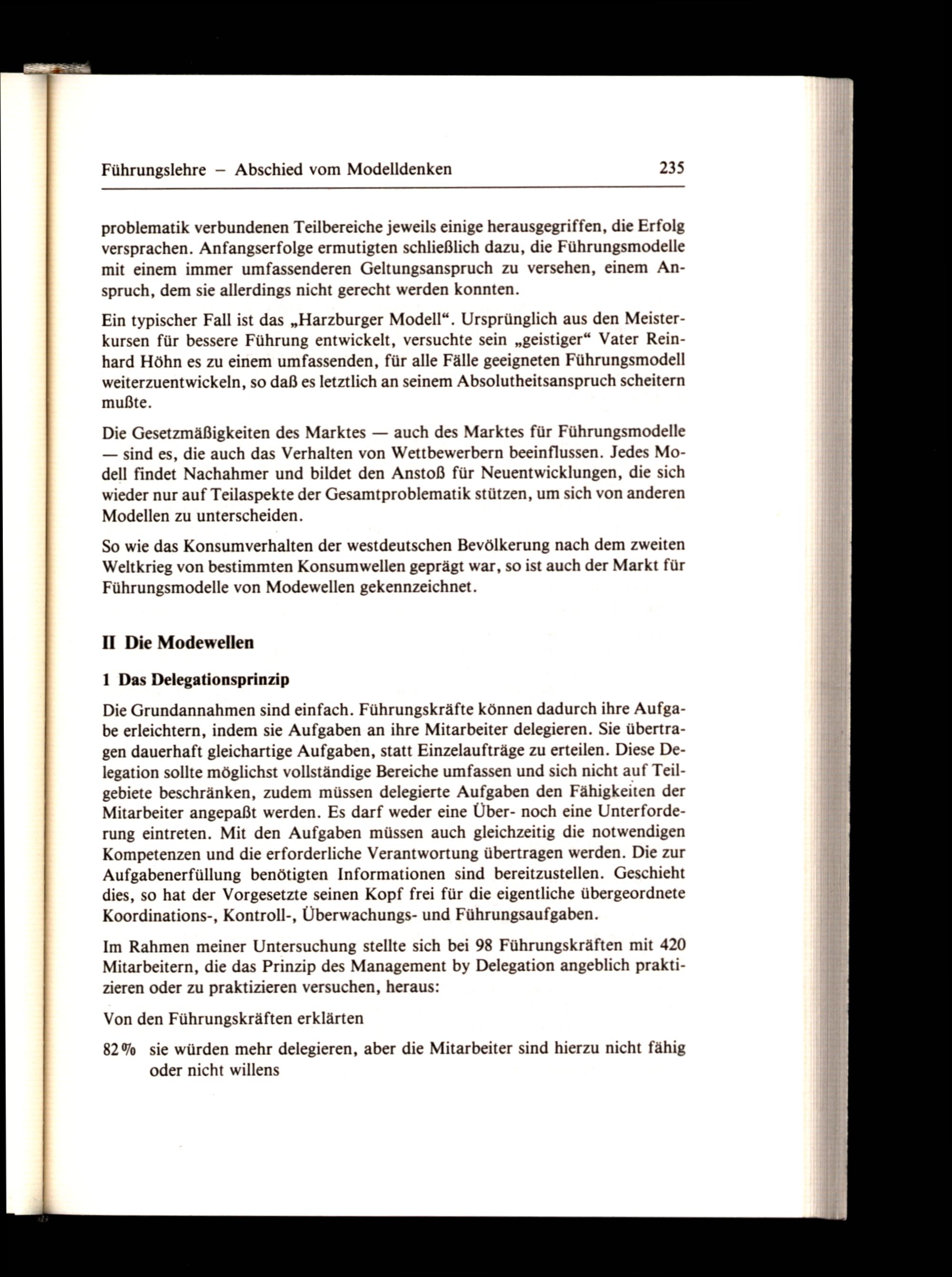 Ein typischer Fall ist das„Harzburger Modell“. Ursprünglich aus den Meisterkursen für bessere Führung entwickelt, versuchte sein„geistiger“ Vater Reinhard Höhn es zu einem umfassenden, für alle Fälle geeigneten Führungsmodell weiterzuentwickeln, so daß es letztlich an seinem Absolutheitsanspruch scheitern mußte.