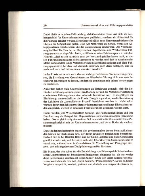 Dabei bleibt es in jedem Falle wichtig, daß Grundsätze dieser Art nicht als Aushängeschild für Unternehmensleitungen publiziert, sondern als Hilfsmittel für die Führung genutzt werden. Sie sollen schließlich auch Firmenangehörigen aller Ebenen die Möglichkeit bieten, eine Art Notbremse zu ziehen, wenn sich Alltagspraktiken einschleichen, die die Zielerreichung erschweren. Als Vorstandsmitglied Rolf Heffner bei der Bayerischen Hypotheken- und Wechselbank Führungsgrundsätze eingeführt hatte, schilderte er seine Erfahrungen u.a. mit dem Hinweis,„daß es sich natürlich auch der Vorstand gefallen lassen muß, an diesen Führungsgrundsätzen selbst gemessen zu werden und daß in zunehmenden Maße insbesondere junge Mitarbeiter sich in Konfliktsituationen auf diese Führungsgrundsätze berufen und dadurch natürlich auch dazu beitragen, daß sie nach und nach im Unternehmen verankert werden.“