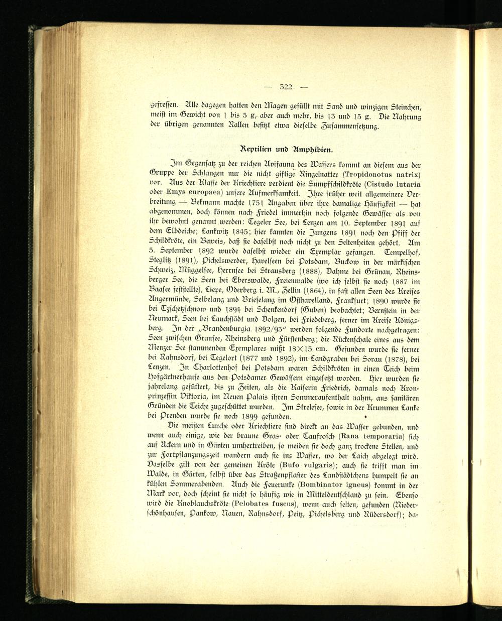 Die meisten Lurche oder Kriechtiere sind direkt an das Wasser gebunden, und wenn auch einige, wie der braune Gras- oder Taufrosch (Runs, tvmporuriu) sich auf Ackern und in Gärten umhertreiben, so meiden sie doch ganz trockene Stellen, und zur Fortpflanzungszeit wandern auch sie ins Wasser, wo der Laich abgelegt wird. Dasselbe gilt von der gemeinen Kröte (Luko vulgaris); auch sie trifft man im Walde, in Gärten, selbst über das Straßenpflaster des Landstädtchens humpelt sie an kühlen Sommerabenden. Auch die Feuerunke (Dombiuutor iAiums) kommt in der Mark vor, doch scheint sie nicht so häufig wie in Mitteldeutschland zu sein. Ebenso wird die Knoblauchskröte (Delobutos kusens), wenn auch selten, gefunden (Niederschönhausen, Pankow, Nauen, Rahnsdorf, Peitz, Pichelsberg und Rüdersdorf); da-