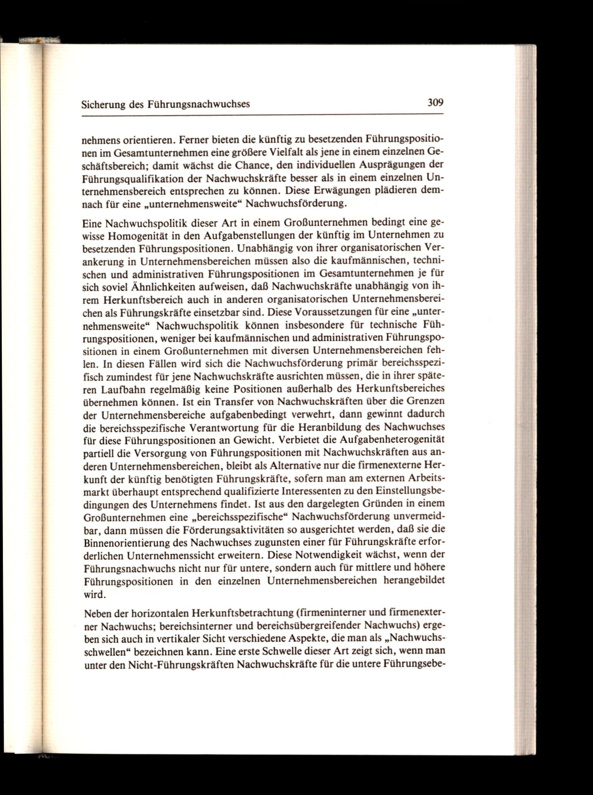nehmens orientieren. Ferner bieten die künftig zu besetzenden Führungspositionen im Gesamtunternehmen eine größere Vielfalt als jene in einem einzelnen Geschäftsbereich; damit wächst die Chance, den individuellen Ausprägungen der Führungsqualifikation der Nachwuchskräfte besser als in einem einzelnen Unternehmensbereich entsprechen zu können. Diese Erwägungen plädieren demnach für eine„unternehmensweite“ Nachwuchsförderung.