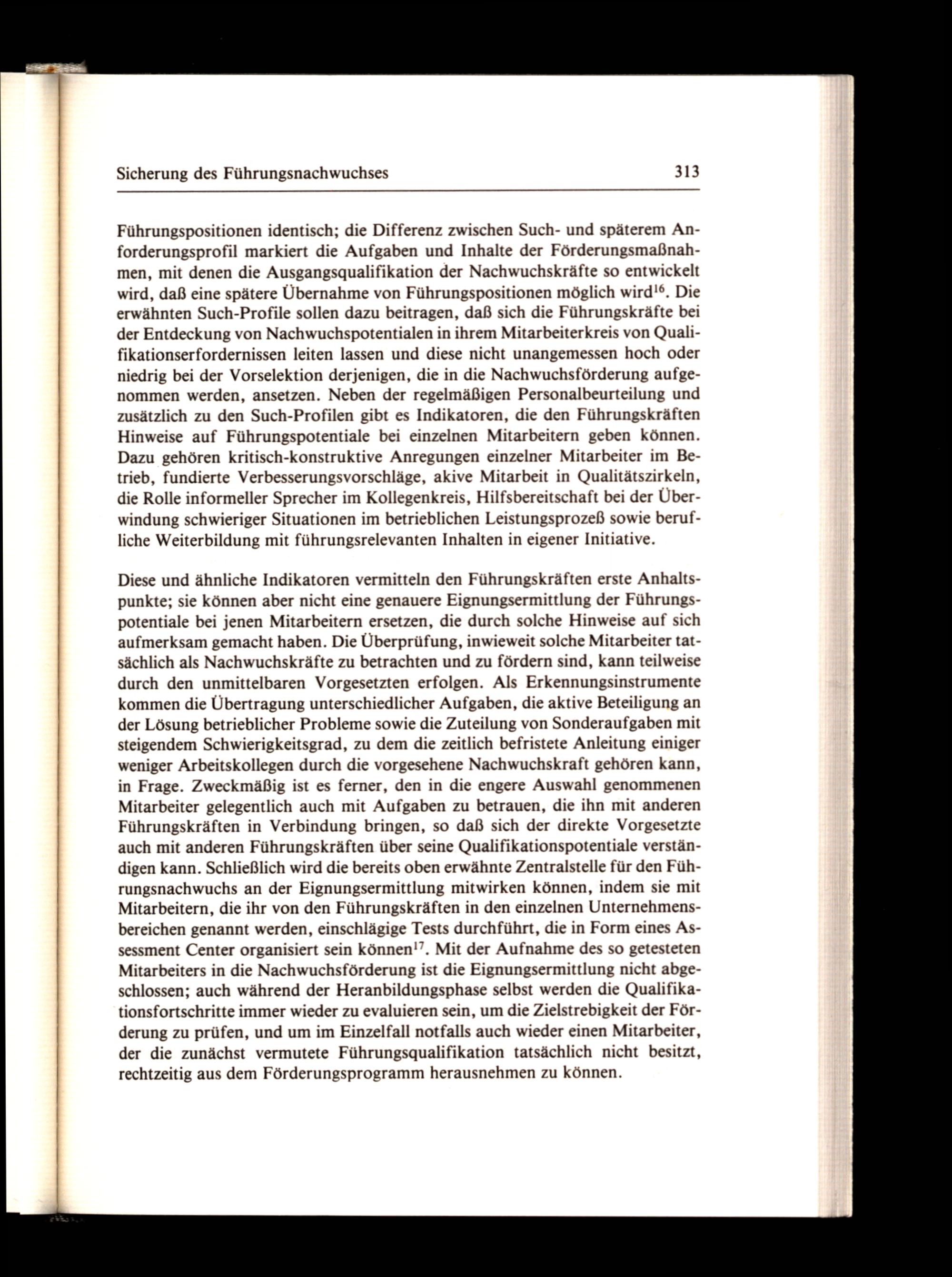 Führungspositionen identisch; die Differenz zwischen Such- und späterem Anforderungsprofil markiert die Aufgaben und Inhalte der Förderungsmaßnahmen, mit denen die Ausgangsqualifikation der Nachwuchskräfte so entwickelt wird, daß eine spätere Übernahme von Führungspositionen möglich wird!®, Die erwähnten Such-Profile sollen dazu beitragen, daß sich die Führungskräfte bei der Entdeckung von Nachwuchspotentialen in ihrem Mitarbeiterkreis von Qualifikationserfordernissen leiten lassen und diese nicht unangemessen hoch oder niedrig bei der Vorselektion derjenigen, die in die Nachwuchsförderung aufgenommen werden, ansetzen. Neben der regelmäßigen Personalbeurteilung und zusätzlich zu den Such-Profilen gibt es Indikatoren, die den Führungskräften Hinweise auf Führungspotentiale bei einzelnen Mitarbeitern geben können. Dazu gehören kritisch-konstruktive Anregungen einzelner Mitarbeiter im Betrieb, fundierte Verbesserungsvorschläge, akive Mitarbeit in Qualitätszirkeln, die Rolle informeller Sprecher im Kollegenkreis, Hilfsbereitschaft bei der Überwindung schwieriger Situationen im betrieblichen Leistungsprozeß sowie berufliche Weiterbildung mit führungsrelevanten Inhalten in eigener Initiative.