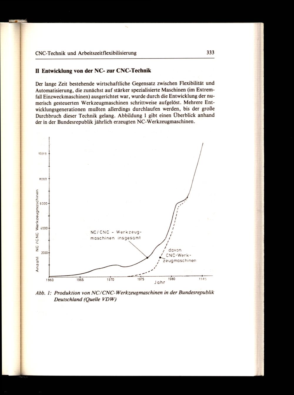 Der lange Zeit bestehende wirtschaftliche Gegensatz zwischen Flexibilität und Automatisierung, die zunächst auf stärker spezialisierte Maschinen(im Extremfall Einzweckmaschinen) ausgerichtet war, wurde durch die Entwicklung der numerisch gesteuerten Werkzeugmaschinen schrittweise aufgelöst. Mehrere Entwicklungsgenerationen mußten allerdings durchlaufen werden, bis der große Durchbruch dieser Technik gelang. Abbildung 1 gibt einen Überblick anhand der in der Bundesrepublik jährlich erzeugten NC-Werkzeugmaschinen.