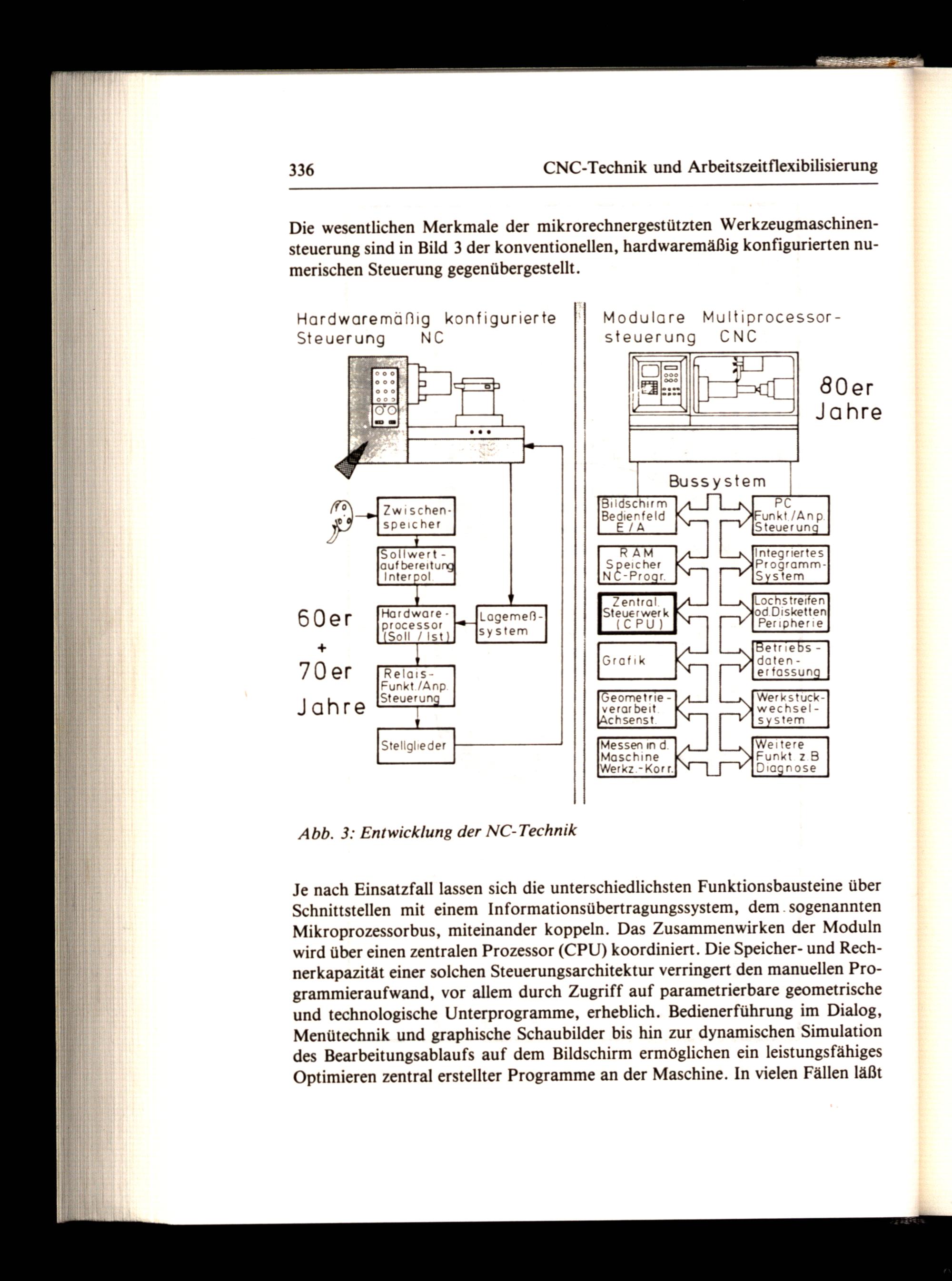 Je nach Einsatzfall lassen sich die unterschiedlichsten Funktionsbausteine über Schnittstellen mit einem Informationsübertragungssystem, dem.sogenannten Mikroprozessorbus, miteinander koppeln. Das Zusammenwirken der Moduln wird über einen zentralen Prozessor(CPU) koordiniert. Die Speicher- und Rechnerkapazität einer solchen Steuerungsarchitektur verringert den manuellen Programmieraufwand, vor allem durch Zugriff auf parametrierbare geometrische und technologische Unterprogramme, erheblich. Bedienerführung im Dialog, Menütechnik und graphische Schaubilder bis hin zur dynamischen Simulation des Bearbeitungsablaufs auf dem Bildschirm ermöglichen ein leistungsfähiges Optimieren zentral erstellter Programme an der Maschine. In vielen Fällen läßt