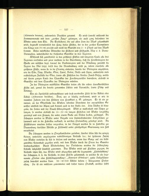 Ein als Speisefisch unbrauchbarer und doch wertvoller Fisch ist der Uckelei oder Nckelei h^lburnns Incickuch. Dort, wo er häufig vorkommt, wird er wie in manchen Jahren von den Fischern von Frankfurt a. O. gefangen. Er ist ein gemeiner, an der Oberfläche des Wassers lebender Bewohner der europäischen Gewässer nördlich der Alpen und kommt auch in den Paffs vor. Sein Rücken ist blau- grün, die Seiten und der Bauch silberglänzend. Wird er massenhaft mit Netzen gefangen, so werden alsbald die (0—20 ein langen Fischchen mit Wasser sorgfältig gereinigt und von Frauen, die unter einem Dache am Boden hocken, geschuppt. Die Schuppen werden in Wasser unter Beigabe von fäulnishindernder Salizylsäure gesammelt und in die Fabriken verkauft, in welchen Perlenessenz gefertigt wird. Die Fischkadaver wurden früher vergraben, in der Neuzeit werden sie in Fabriken zur Verwendung tierischer Abfälle zu Fischmehl unter gleichzeitiger Gewinnung von Fett verarbeitet.