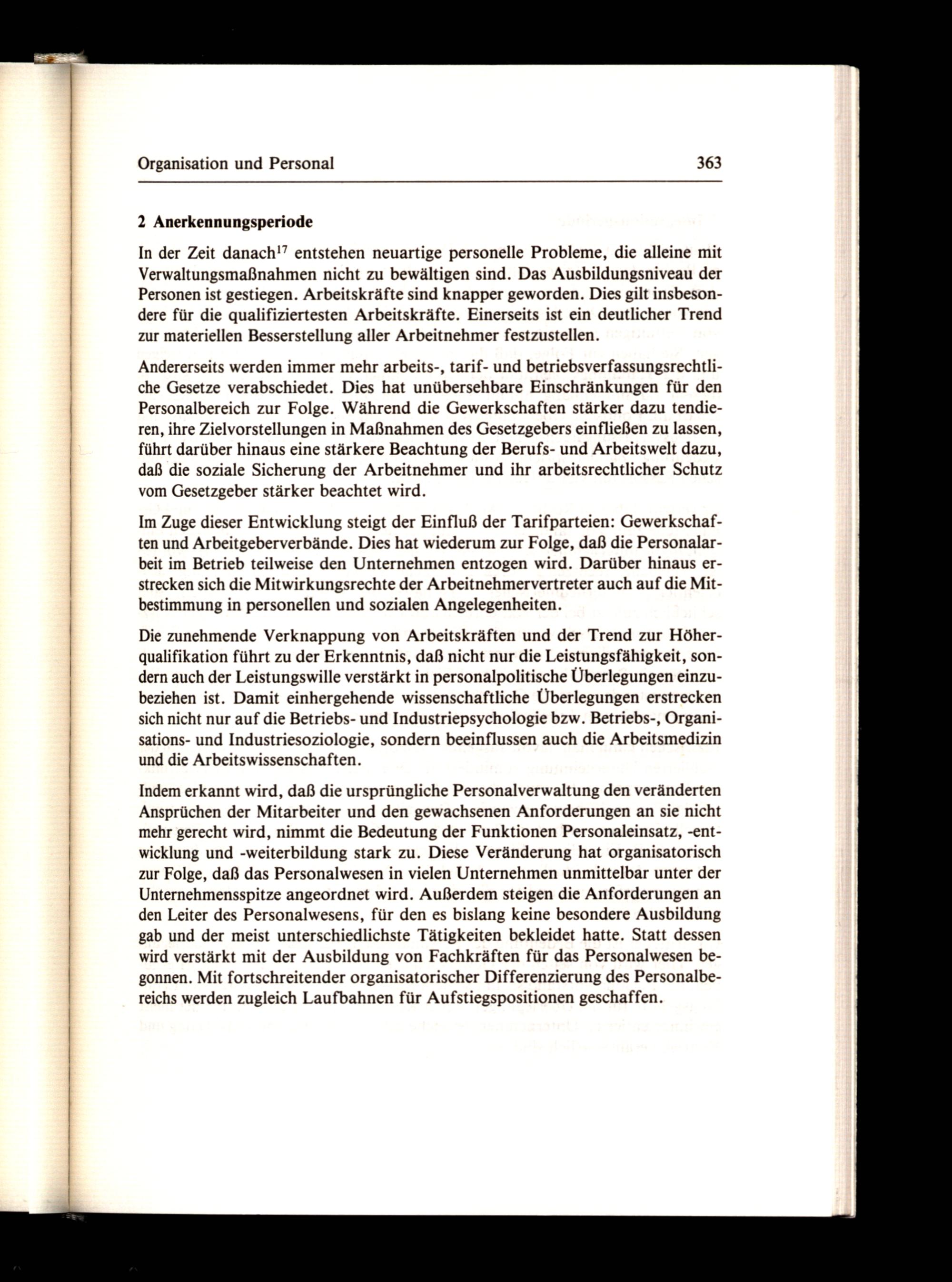 Indem erkannt wird, daß die ursprüngliche Personalverwaltung den veränderten Ansprüchen der Mitarbeiter und den gewachsenen Anforderungen an sie nicht mehr gerecht wird, nimmt die Bedeutung der Funktionen Personaleinsatz,-entwicklung und-weiterbildung stark zu. Diese Veränderung hat organisatorisch zur Folge, daß das Personalwesen in vielen Unternehmen unmittelbar unter der Unternehmensspitze angeordnet wird. Außerdem steigen die Anforderungen an den Leiter des Personalwesens, für den es bislang keine besondere Ausbildung gab und der meist unterschiedlichste Tätigkeiten bekleidet hatte. Statt dessen wird verstärkt mit der Ausbildung von Fachkräften für das Personalwesen begonnen. Mit fortschreitender organisatorischer Differenzierung des Personalbereichs werden zugleich Laufbahnen für Aufstiegspositionen geschaffen.
