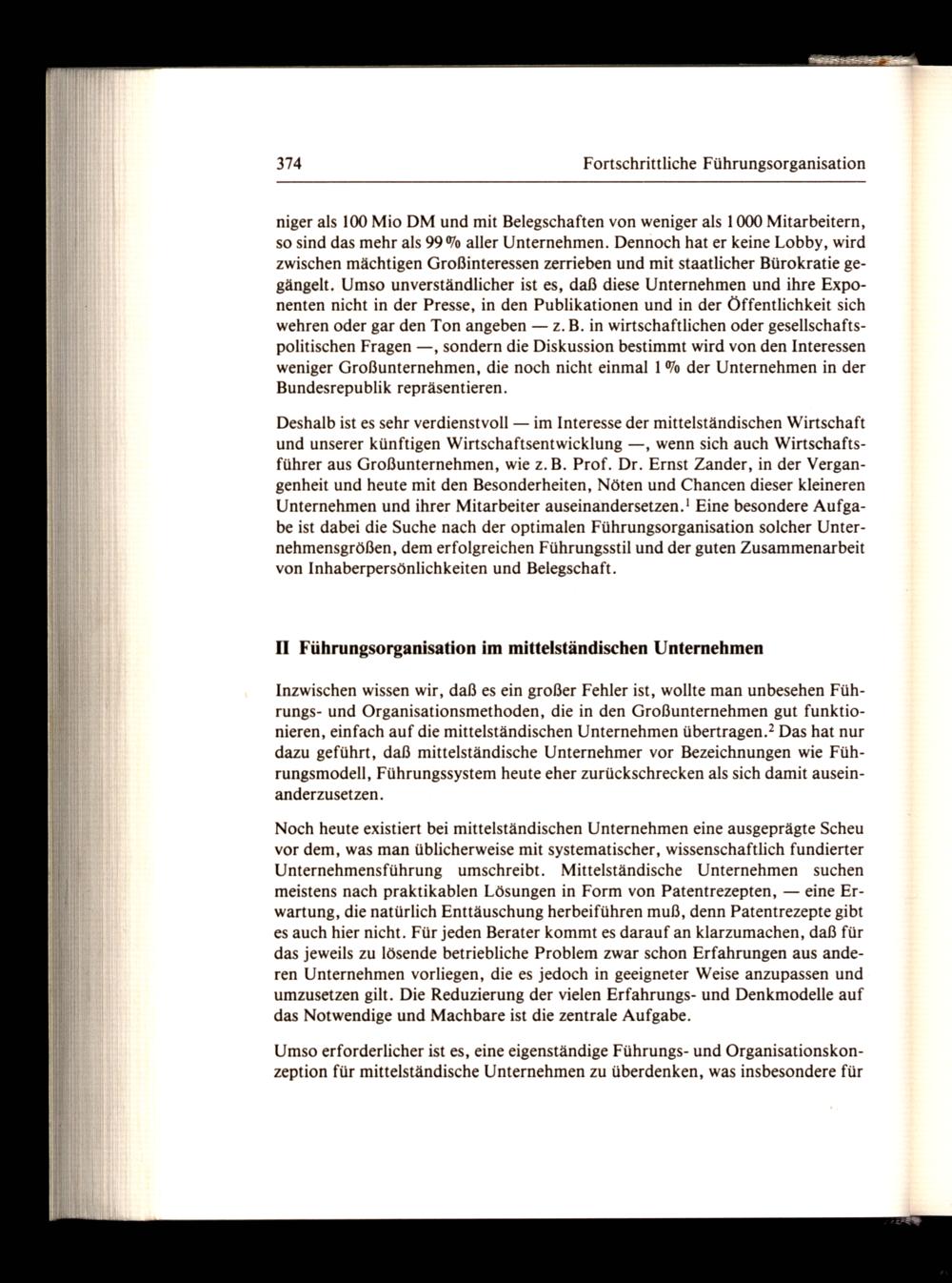 Deshalb ist es sehr verdienstvoll— im Interesse der mittelständischen Wirtschaft und unserer künftigen Wirtschaftsentwicklung—, wenn sich auch Wirtschaftsführer aus Großunternehmen, wie z.B. Prof. Dr. Ernst Zander, in der Vergangenheit und heute mit den Besonderheiten, Nöten und Chancen dieser kleineren Unternehmen und ihrer Mitarbeiter auseinandersetzen.! Eine besondere Aufgabe ist dabei die Suche nach der optimalen Führungsorganisation solcher Unternehmensgrößen, dem erfolgreichen Führungsstil und der guten Zusammenarbeit von Inhaberpersönlichkeiten und Belegschaft.