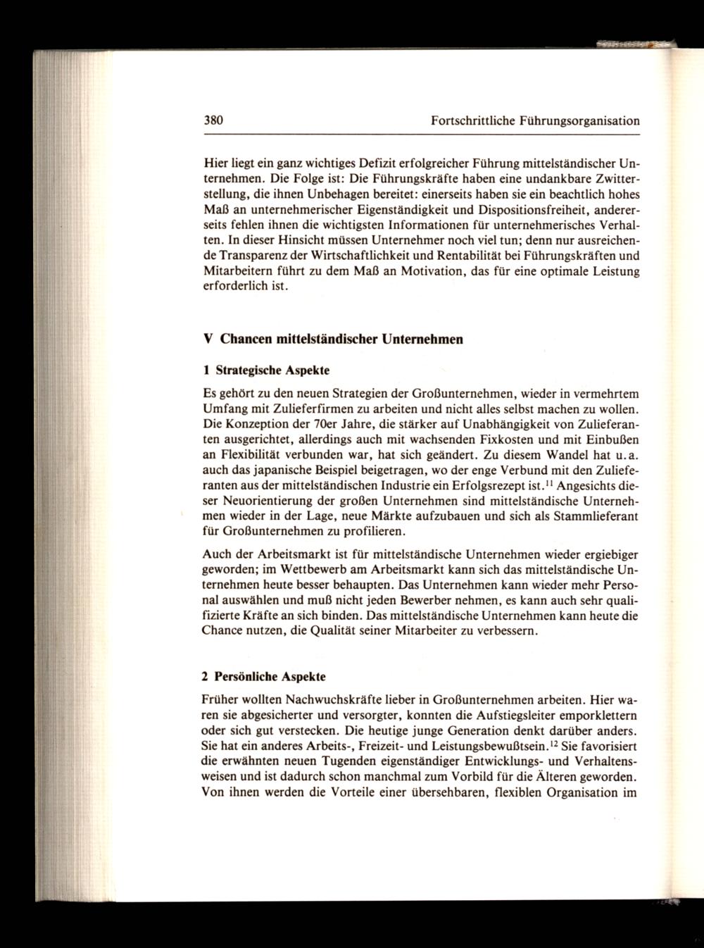 Früher wollten Nachwuchskräfte lieber in Großunternehmen arbeiten. Hier waren sie abgesicherter und versorgter, konnten die Aufstiegsleiter emporklettern oder sich gut verstecken. Die heutige junge Generation denkt darüber anders. Sie hat ein anderes Arbeits-, Freizeit- und Leistungsbewußtsein.'!? Sie favorisiert die erwähnten neuen Tugenden eigenständiger Entwicklungs- und Verhaltensweisen und ist dadurch schon manchmal zum Vorbild für die Älteren geworden. Von ihnen werden die Vorteile einer übersehbaren, flexiblen Organisation im