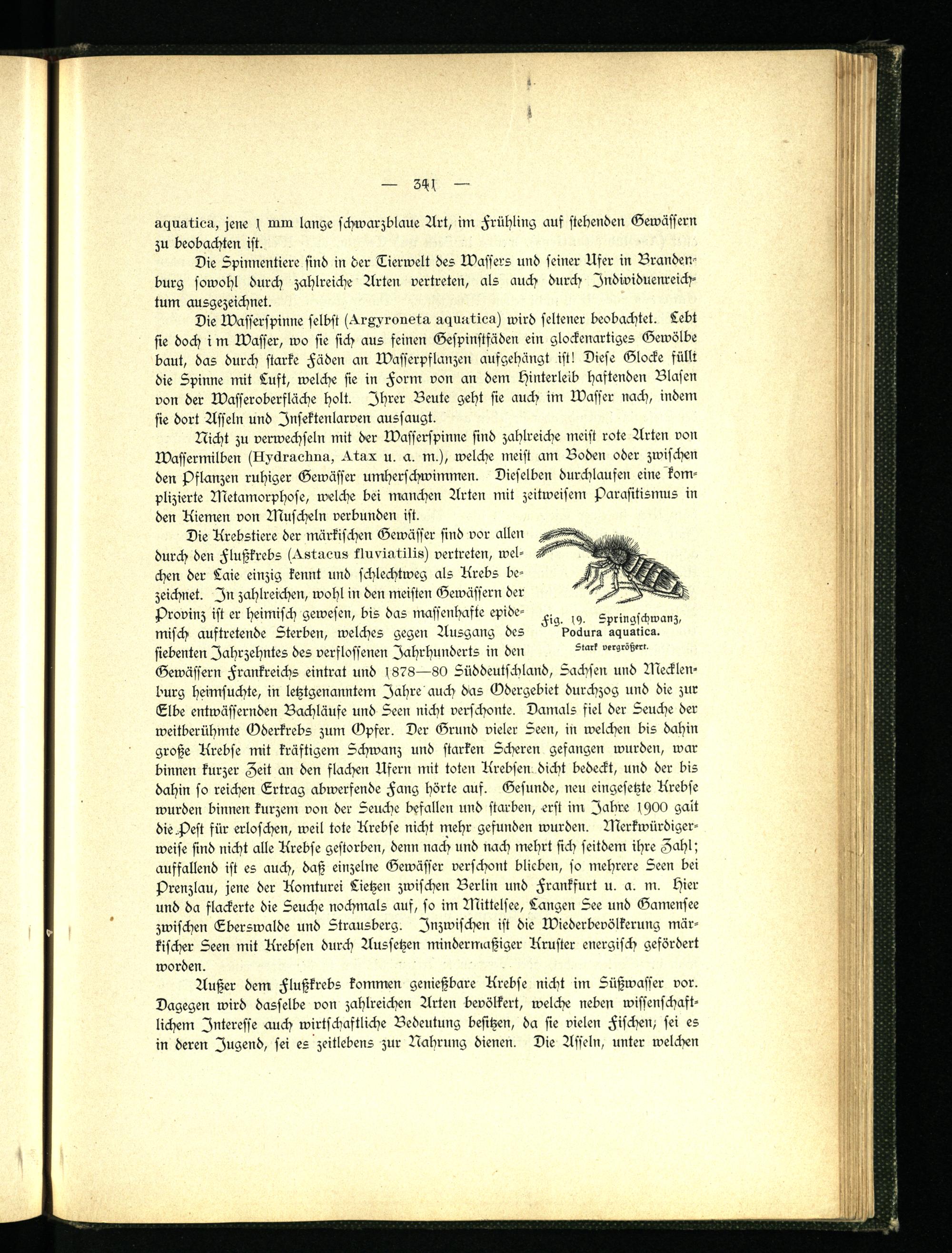 Die Krebstiere der märkischen Gewässer sind vor allen durch den Flußkrebs h^stuous kluviutllls) vertreten, welchen der Laie einzig kennt und schlechtweg als Krebs bezeichnet. In zahlreichen, wohl in den meisten Gewässern der Provinz ist er heimisch gewesen, bis das massenhafte epidemisch auftretende Sterben, welches gegen Ausgang des siebenten Jahrzehntes des verflossenen Jahrhunderts in den Gewässern Frankreichs eintrat und 1878—80 Süddeutschland, Sachsen und Mecklenburg heimsuchte, in letztgenanntem Jahre auch das Odergebiet durchzog und die zur Elbe entwässernden Bachläufe und Seen nicht verschonte. Damals siel der Seuche der weitberühmte Oderkrebs zum Opfer. Der Grund vieler Seen, in welchen bis dahin große Krebse mit kräftigem Schwanz und starken Scheren gefangen wurden, war binnen kurzer Zeit an den flachen Ufern mit toten Krebsen dicht bedeckt, und der bis dahin so reichen Ertrag abwerfende Fang hörte auf. Gesunde, neu eingesetzte Krebse wurden binnen kurzem von der Seuche befallen und starben, erst im Iabre IH00 galt die.Pest für erloschen, weil tote Krebse nicht mehr gefunden wurden. Merkwürdigerweife sind nicht alle Krebse gestorben, denn nach und nach mehrt sich seitdem ihre Zahl; auffallend ist es auch, daß einzelne Gewässer verschont blieben, so mehrere Seen bei prenzlau, jene der Komturei Lietzen zwischen Berlin und Frankfurt u. a. m. Hier und da flackerte die Seuche nochmals auf, so im Mittelsee, Langen See und Gamensee zwischen Eberswalde und Strausberg. Inzwischen ist die Wiederbevölkerung märkischer Seen mit Krebsen durch Aussetzen mindermaßiger Kruster energisch gefördert worden.