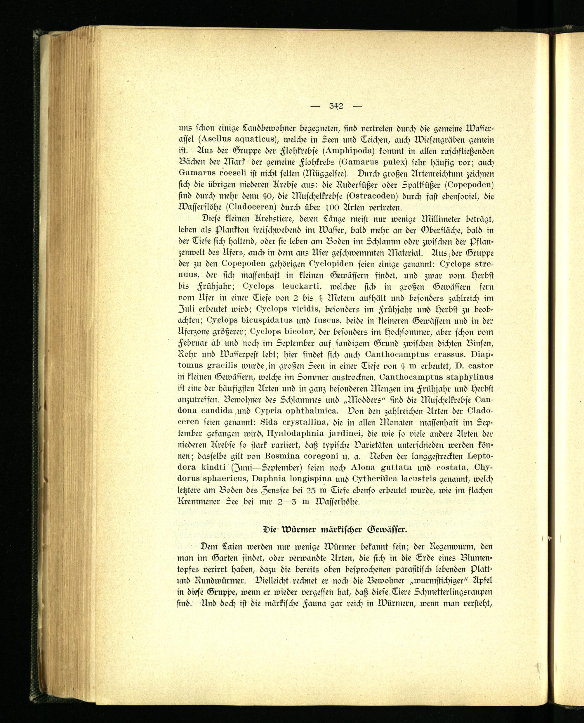 uns schon einige Landbewohner begegneten, sind vertreten durch die gemeine Wasserassel (Eselin« aquntäeuch, welche in Leen und Teichen, auch Wiesengräben gemein ist. Aus der Gruppe der Flohkrebse s^mpbipoclu) kommt in allen raschfließenden Bächen der Mark der gemeine Flohkrebs (Oniuarus putex) sehr häufig vor; auch Oamurus ro686li ist nicht selten (Müggelsee). Durch großen Artenreichtum zeichnen sich die übrigen niederen Krebse aus: die Ruderfüßer oder Spaltfüßer (Lopopockon) sind durch mehr denn 40, die Muschelkrebse (Ostvaeockeu) durch fast ebensoviel, die Wasserflöhe (tAnäoekrsii) durch über t 00 Arten vertreten.