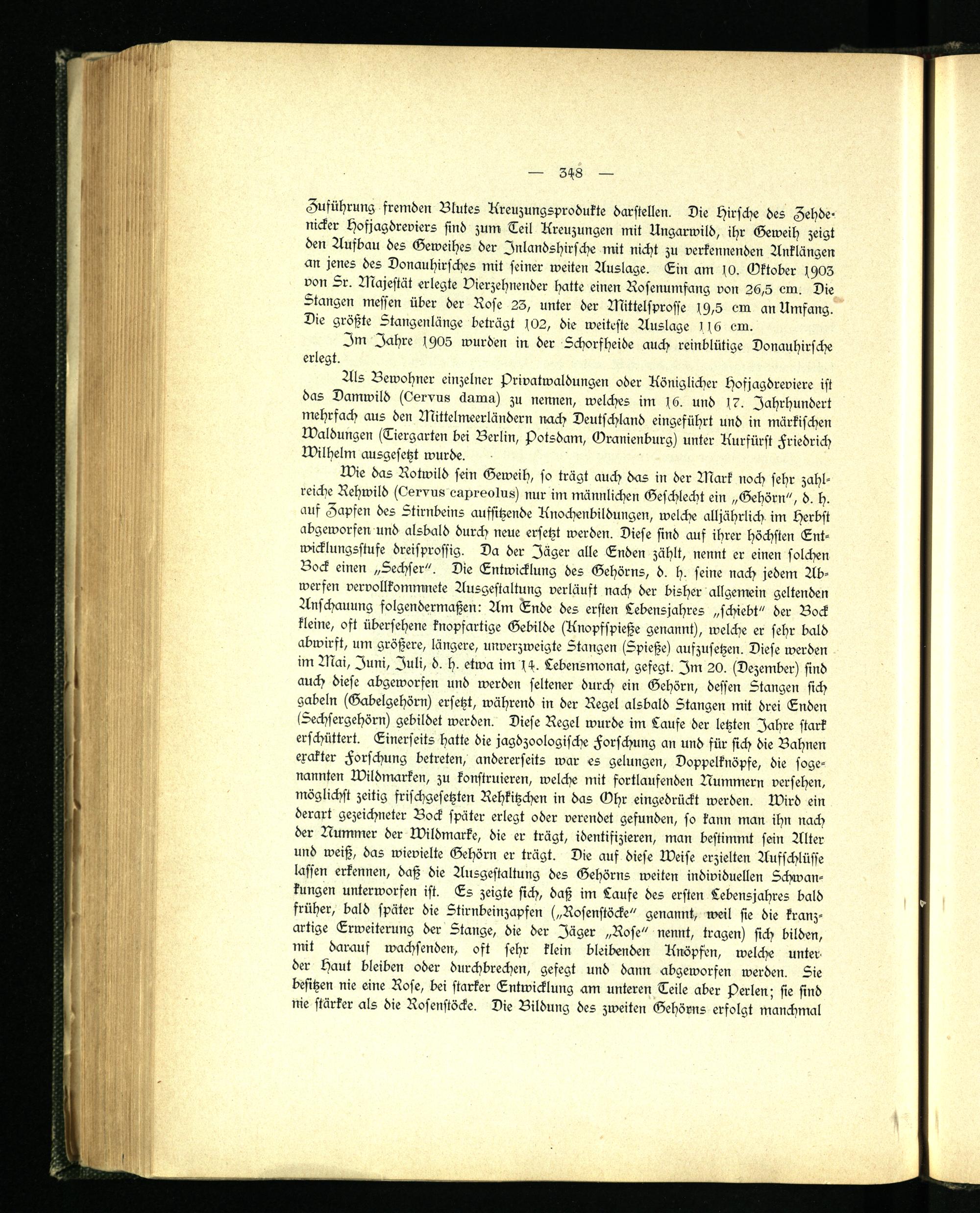 Zuführung fremden Blutes Irreuzungsprodukte darstellen. Die Hirsche des Zehde- nicker Hofjagdreviers sind zum Teil Kreuzungen mit Ungarwild, ihr Geweih zeigt den Aufbau des Geweihes der Inlandshirsche mit nicht zu verkennenden Anklängen an jenes des Donauhirsches mit seiner weiten Auslage. Ein am >0. (Oktober Hf03 von Sr. Majestät erlegte Vierzehnender hatte einen Rosenumfang von 26,5 um. Die Stangen messen über der Rose 23, unter der Mittelsprosse ist,5 um an Umfang. Die größte Stangenlänge beträgt f02, die weiteste Auslage 116 um.