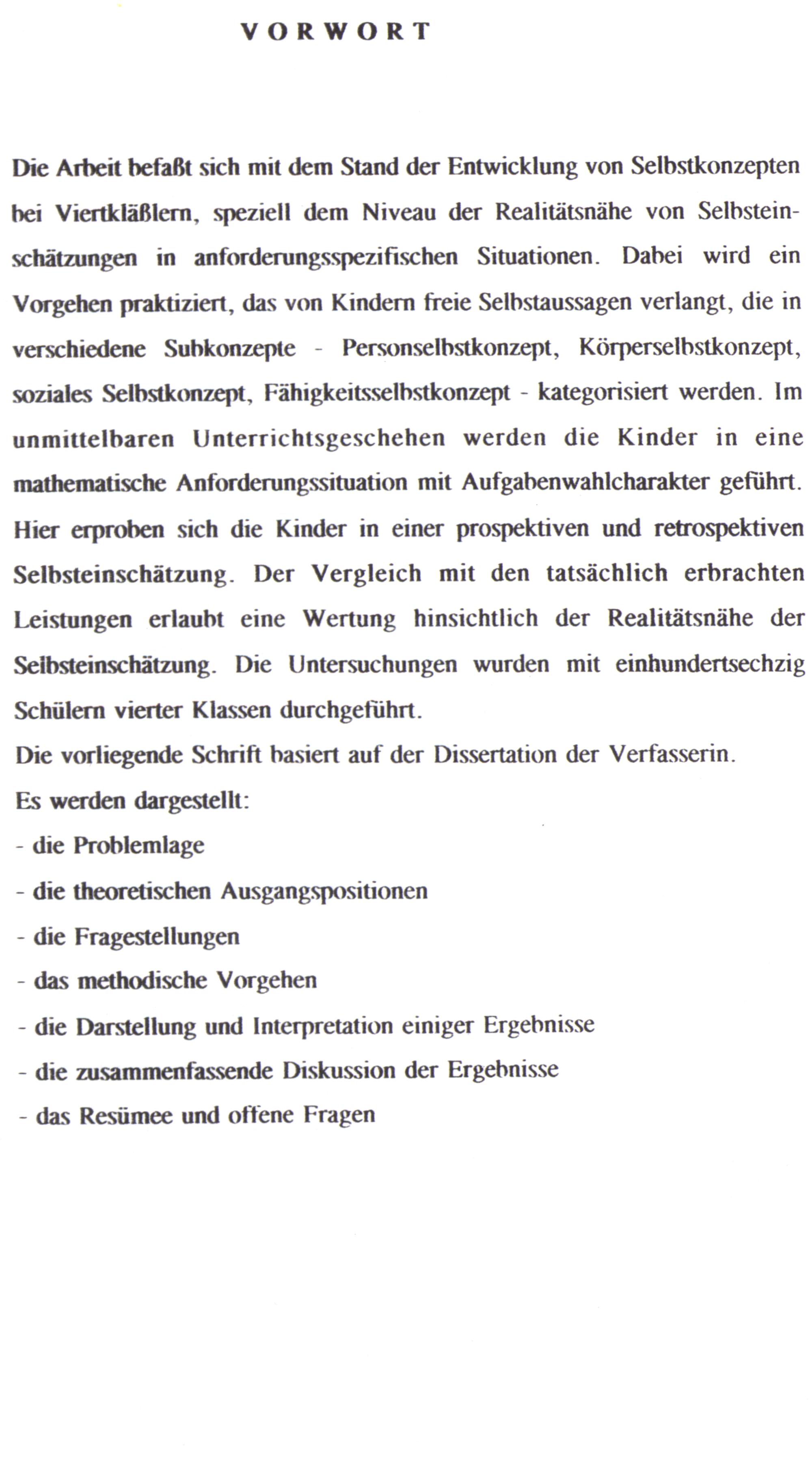 Die Arbeit befaßt sich mit dem Stand der Entwicklung von Selbstkonzepten bei Viertkläßlern, speziell dem Niveau der Realıtätsnähe von Selbsteinschätzungen in anforderungsspezifischen Situationen. Dabei wird ein Vorgehen praktiziert, das von Kindern freie Selbstaussagen verlangt, die ın verschiedene Subkonzepte- Personselbstkonzept, Körperselbstkonzept, soziales Selbstkonzept, Fähigkeitsselhstkonzept- kategorisiert werden. Im unmittelbaren Unterrichtsgeschehen werden die Kinder in eine mathematische Anforderungssituation mit Aufgabenwahlcharakter geführt. Hier erproben sich die Kinder in einer prospektiven und retrospektiven Selbsteinschätzung. Der Vergleich mit den tatsächlich erbrachten Leistungen erlaubt eine Wertung hinsichtlich der Realıtätsnähe der Seibsteinschätzung. Die Untersuchungen wurden mit einhundertsechzig Schülern vierter Klassen durchgeführt.