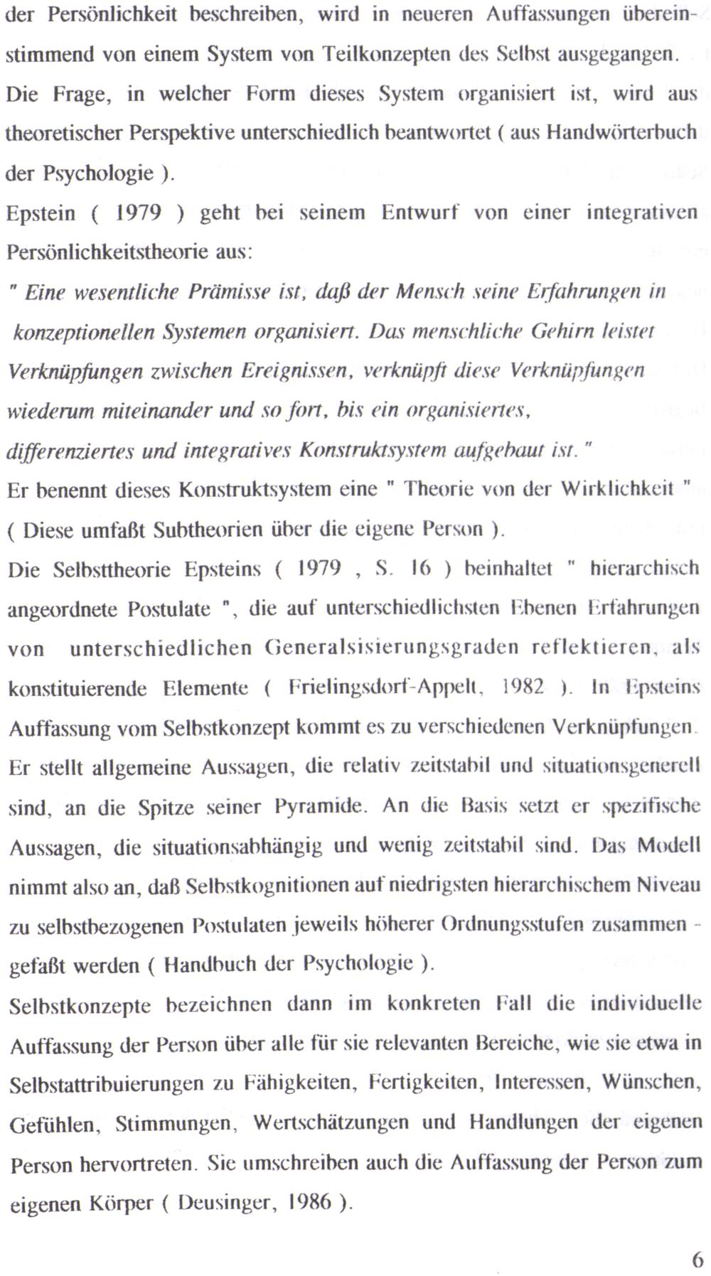 Die Selbsttheorie Epsteins( 1979, S. 16) beinhaltet" hierarchisch angeordnete Postulate”, die auf unterschiedlichsten Ebenen Erfahrungen von unterschiedlichen Generalsisterungsgraden reflektieren, als konstituierende Elemente( Frielingsdorf-Appelt, 1982). In Epsteins Auffassung vom Selbstkonzept kommt es zu verschiedenen Verknüpfungen. Er stellt allgemeine Aussagen, die relativ zeitstabil und situationsgenerell! sind, an die Spitze seiner Pyramide. An die Basıs setzt er spezifische Aussagen, die situationsabhängig und wenig zeitstabil sind. Das Modell nimmt also an, daß Selbstkognitionen auf niedrigsten hierarchischem Niveau zu selbstbezogenen Postulaten jeweils höherer Ordnungsstufen zusammen gefaßt werden( Handbuch der Psychologie).